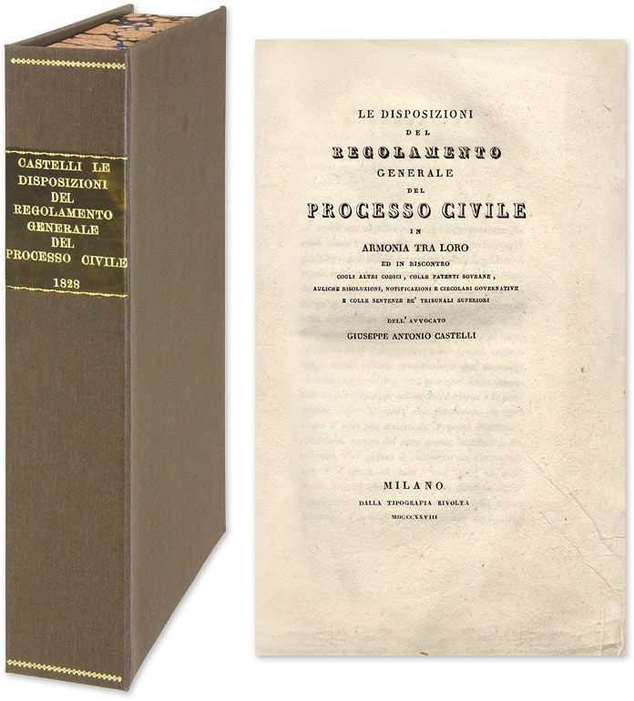 1828. Handbook on Civil Procedure in the Kingdom of Lombardy-Venetia Castelli, Giuseppe Antonio. Le Disposizioni del Regolamento Generale del Processo Civile in Armonia tra Loro ed in Riscontro Cogli Altri Codici, Colle Patenti Sovrane, Auliche Risoluzioni, Notificazioni e Circolari Governative e Colle Sentenze de' Tribunali Superiori. Milan: Dalla Tipografia Rivolta, 1828. [xii], 380 pp. Octavo (9" x 6"). Unbound (signatures joined with flexible vellum tabs), untrimmed edges. Light soiling to exterior, a few signatures loose, light toning to text, interior otherwise fresh. Book housed in cloth clamshell box with calf lettering piece and marbled edges. $950. * First edition. A well-annotated digest of the code of civil procedure of Lombardy-Venetia with concordances to previous codes that governed the region. Established by the Congress of Vienna in 1815, this Northern Italian kingdom was part of the Austrian Empire. Lombardy was annexed to the Sardinia in 1859 and the kingdom ceased to exist when the rest of its territory was annexed to the Kingdom of Italy in 1866. A second edition of Castelli's digest was issued in 1832. Castelli, an attorney in Milan, also produced an annotated edition of the Austrian Civil Code. No copies located on OCLC. Servizio Bibliotecario Nazionale (SBN) ITICCURMGE02519.