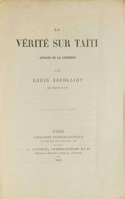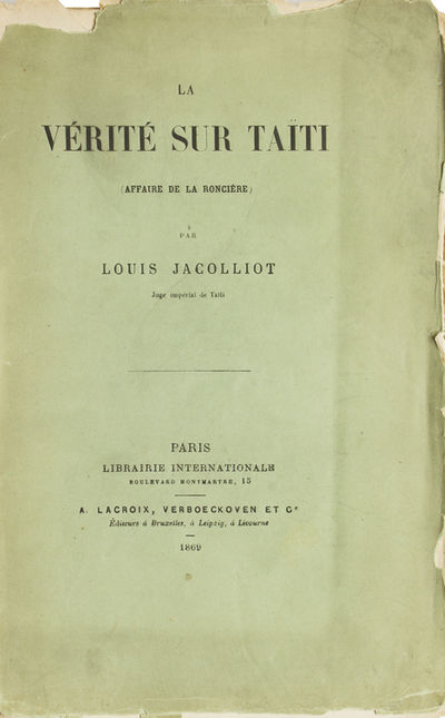 Paris: Librairie Internationale, Boulevard Montmartre, 15. A. Lacroix, Verboeckoven et Cie. Éditeurs à Bruxelles, à Leipzig, à Livourne, 1869. First edition. 56 pp. 1 vols. 8vo. Green printed wrappers, part of back wrapper, mising, front covers chipped at top and loose, else internally fine. First edition. 56 pp. 1 vols. 8vo. Jacolliot was a barrister and author who lived on Tahiti, India and other parts of Asia, He collected and transcribed Sanskrit myths. Madame Blavatsky and Nietzsche were influenced by him.