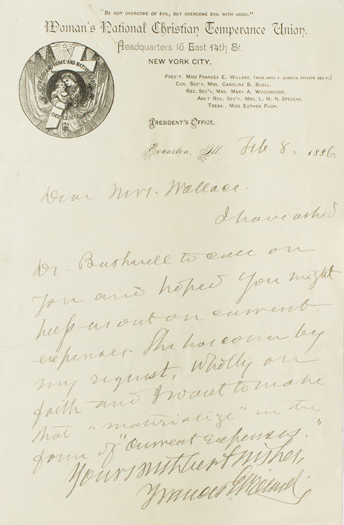 Evanston, Ill, 1886. 1p. on WNCTU stationery. With the original envelope. 1 vols. Old fold lines. Minor wear. Near fine. With envelope. 1p. on WNCTU stationery. With the original envelope. 1 vols. Letter written by Frances Willard to Mrs. Wallace, indicating that she has asked Dr. Bushnell to "call on you and hoped you might help us out on current expenses. She has come by my request, wholly on faith and I want to make that 'materialize' in the form of 'current expenses.'" Willard was prominent in both the suffrage and temperance movements, and was influential in the passage of the 18th and 19th amendments (prohibition and votes for women, respectively); she also helped found the Woman's Christian Temperance Union in 1874. Willard's platform of "Home Protection" as the premise behind suffrage was designed to appeal to women everywhere. She held that if a woman had the right to vote, she could better protect her home and family and improve society.