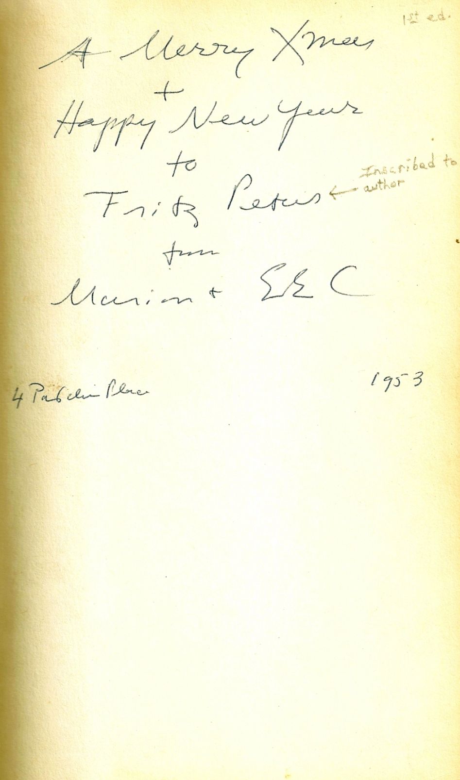 Cambridge: Harvard University Press, 1953. First Edition. Hardcover. Mild staining to cloth. Very Good in a Fair dustwrapper with much loss at the top rear and spine tips. The Trade Edition of these lectures containing much poetry INSCRIBED and SIGNED on the front endpaper by the poet to author Fritz Peters: "A Merry Xmas/+/Happy New Year/to/Fritz Peters/from/Marion + EEC/4 Patchen Place 1953." Scarce to find genuine Cummings inscriptions.