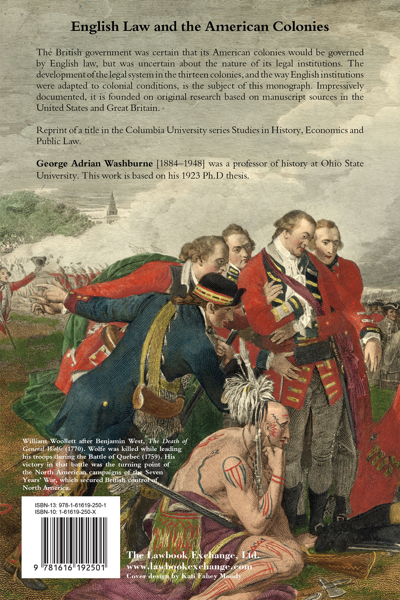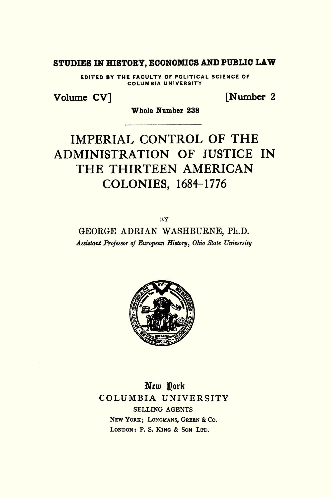 2012. ISBN-13: 9781616192501; ISBN-10: 161619250X. Washburne, George Adrian. Imperial Control of the Administration of Justice in the Thirteen American Colonies, 1684-1776. Originally published: New York: Columbia University Press, 1923. 191 pp. Reprinted 2012 by The Lawbook Exchange, Ltd. ISBN-13: 9781616192501; ISBN-10: 161619250X Paperback. New. $17.95 * The British government was certain that its American colonies would be governed by English law, but was uncertain about the nature of its legal institutions. The development of the legal system in the thirteen colonies, and the way English institutions were adapted to colonial conditions, is the subject of this monograph. Impressively documented, it is founded on original research based on manuscript sources in the United States and Great Britain. Reprint of a title in the Columbia University series Studies in History, Economics and Public Law. George Adrian Washburne [1884-1948] was a professor of history at Ohio State University. This work is based on his 1923 Ph.D thesis.
