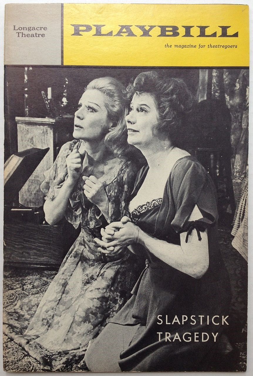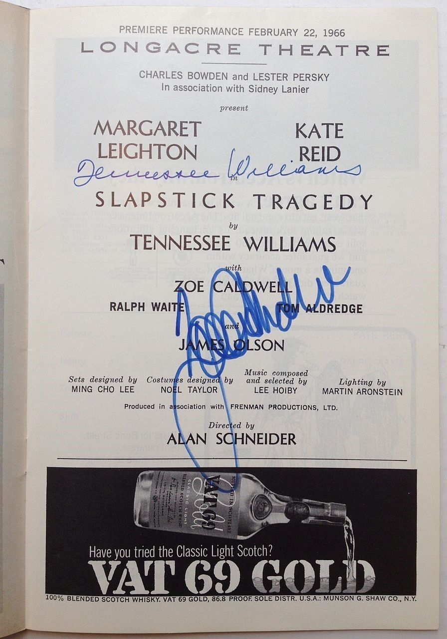 New York, 1966. pamphlet. 52 pages, 9 x 6 inches, scarce signed Playbill for the opening-night performance of "Slapstick Tragedy" on February 22, 1966, at the Longacre Theatre, starring Margaret Leighton and Kate Reid. The critics were very harsh and Williams' easily-bruised ego kept him away from the theatre after opening night. "Slapstick Tragedy" closed four days later yielding just seven performances. Boldly signed on the credits page with the additional signature of actor Zoe Caldwell. Near fine condition.