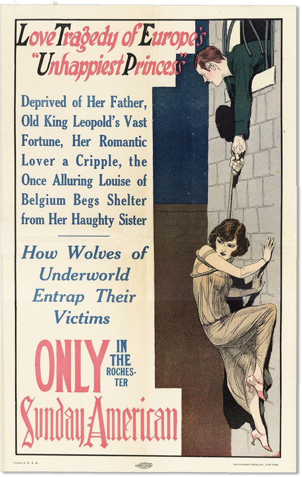 Rochester: Office of the American, 1904. Broadside extra, lithographed in colors; 18" x 11". Single fold, else fine. Colorful graphic depicting Princess Louise escaping from her asylum cell with the help of her illegitimate lover Geza Mattattich. The caption tempts readers with a White Slavery theme, suggesting that Princess Louise has been lured to her ruin by a "Wolf of the Underworld." Unlocated.