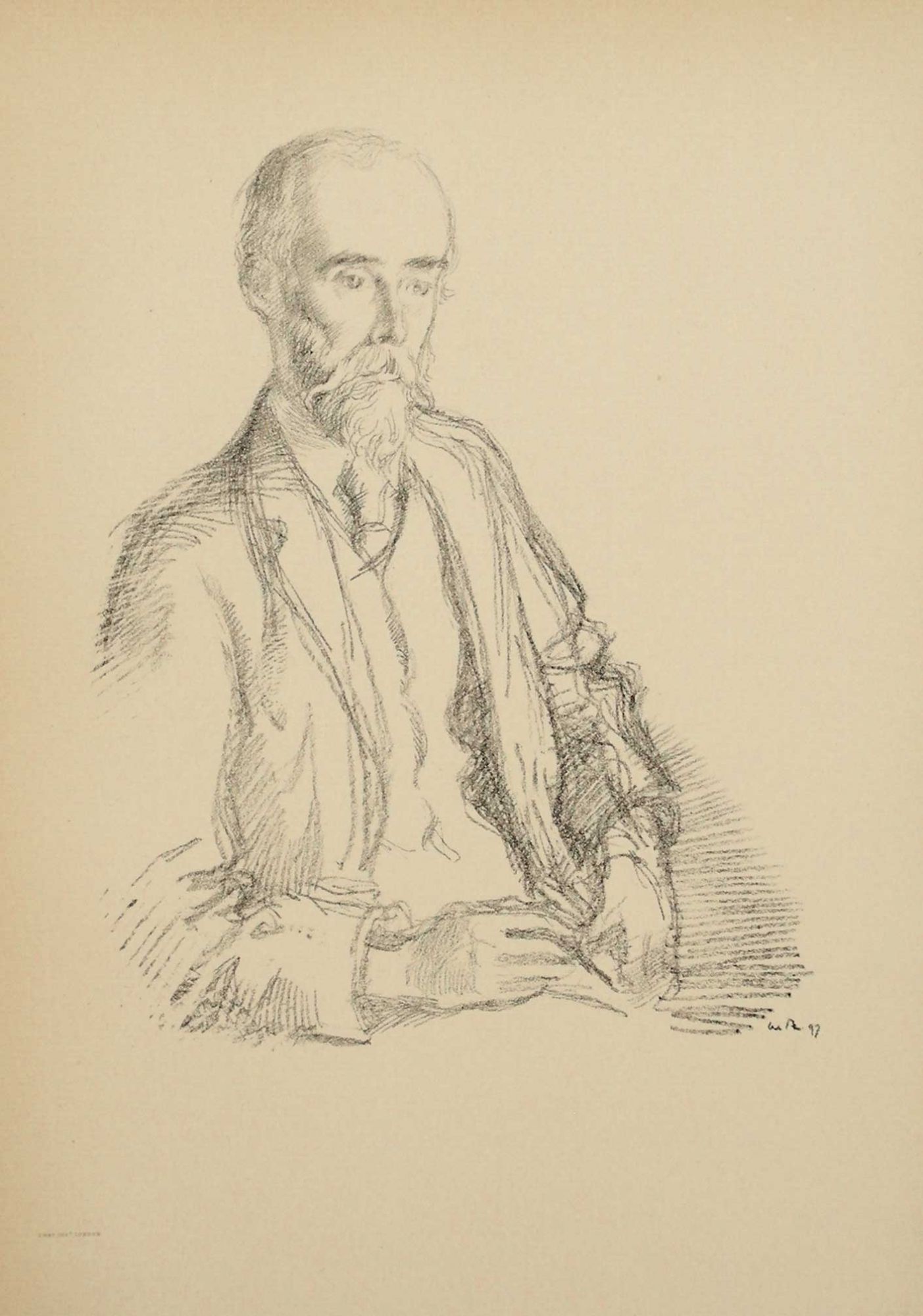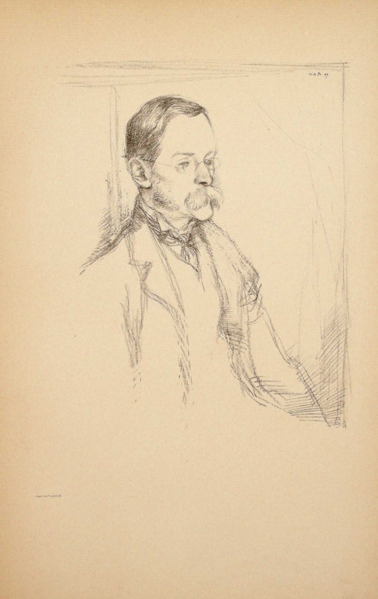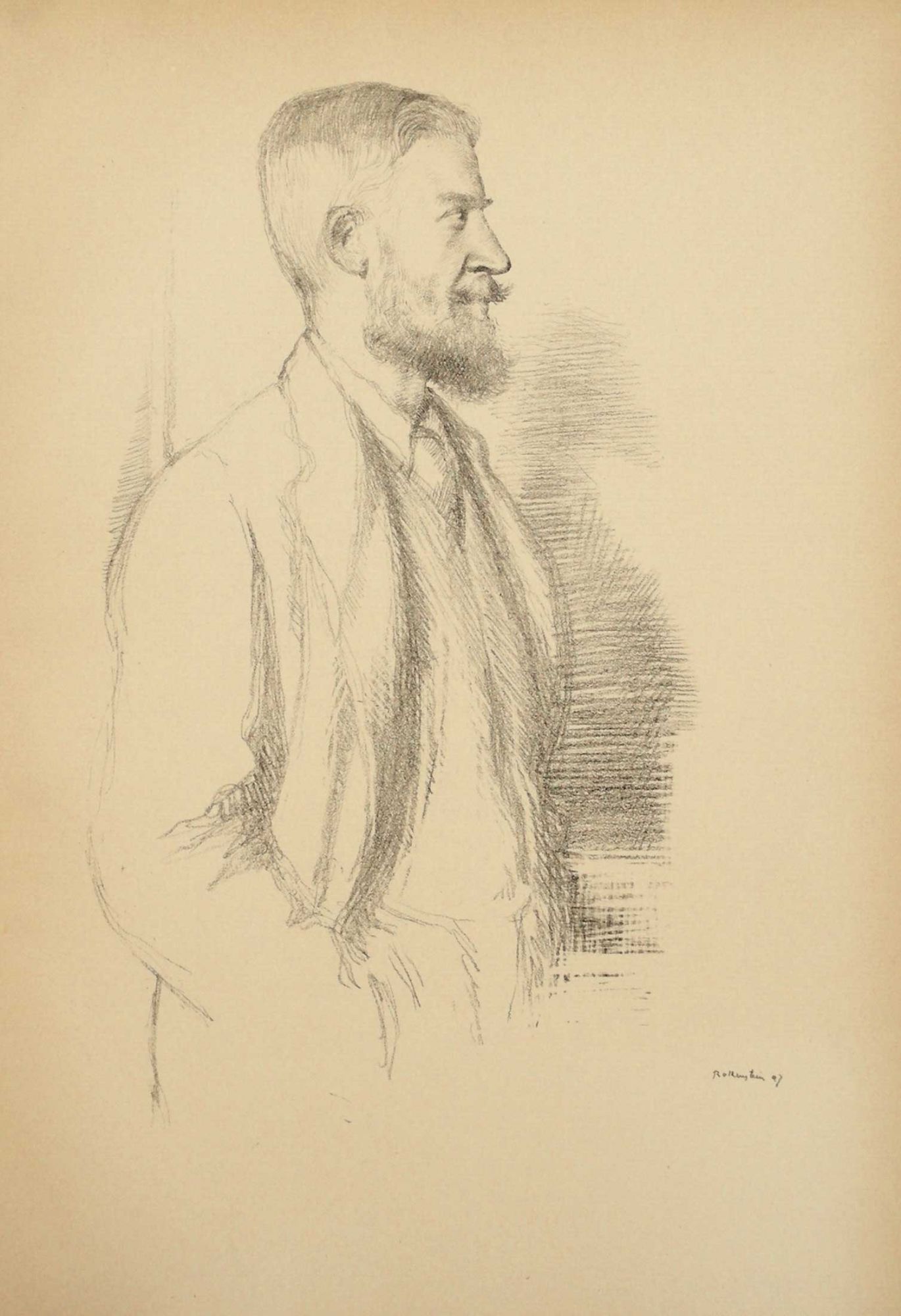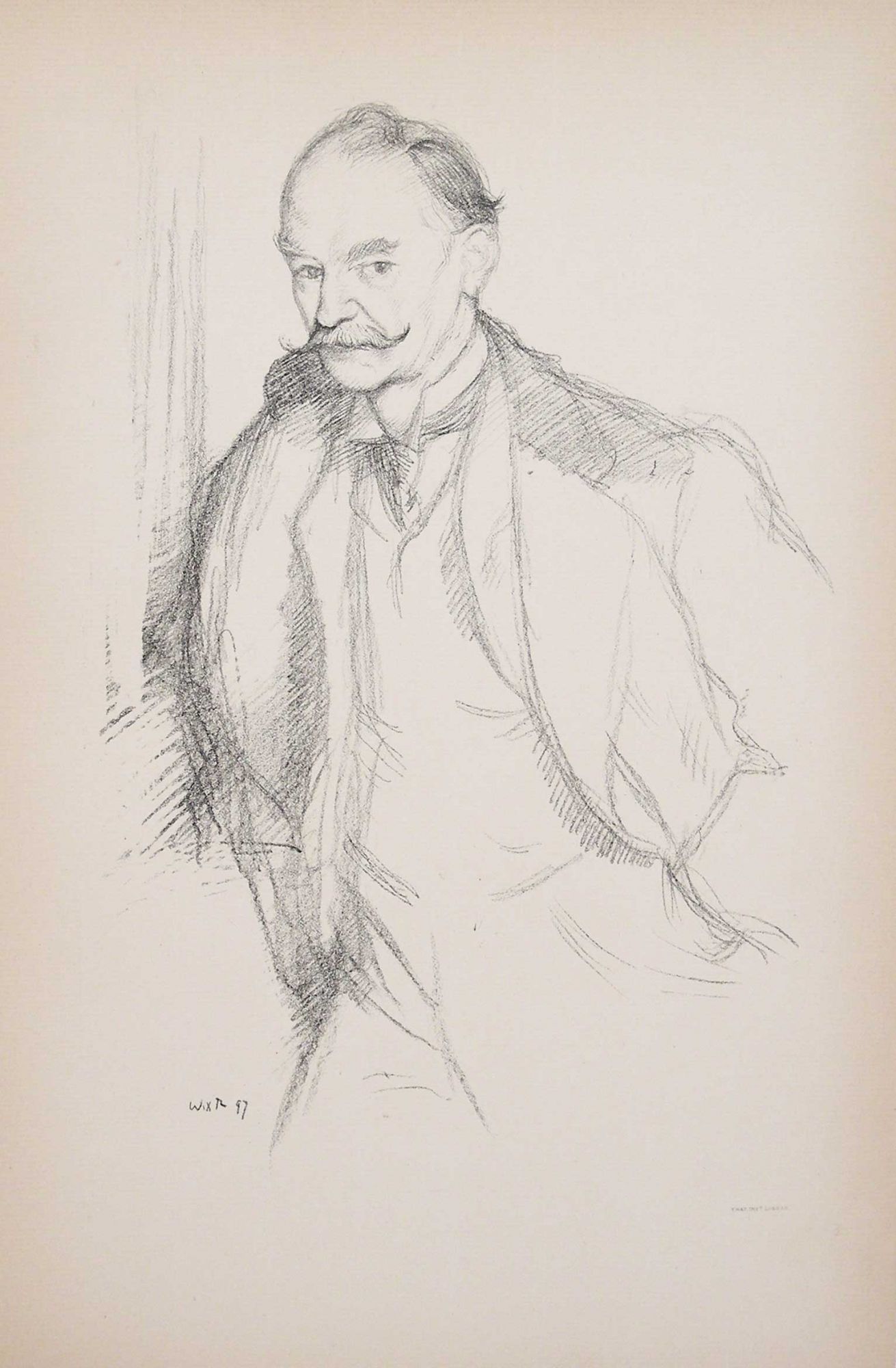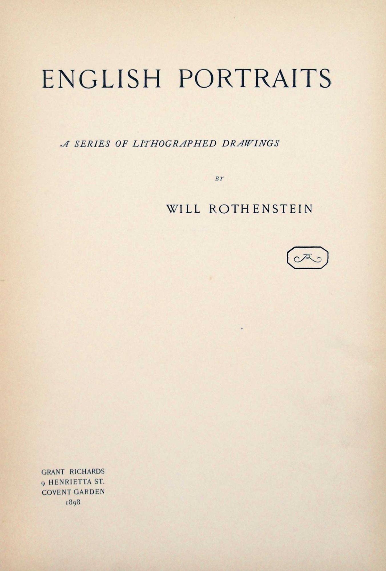 London: Grant Richards, 1898. Original Illustrations. Very Good. Original Illustrations. Scarce. 750 copies printed. These are the disbound pages from English Portraits, with seventeen of Will Rothenstein’s twenty-four lithographs of well-known persons of his day, along with a page of complimentary comments about each person. Rothenstein (1872-1945) was famous for his portraits, and painted Albert Einstein, T.S. Eliot, Thomas Hardy, W.B. Yeats, and Oscar Wilde among many others. Both his painted works and his prints display his great sensitivity and artistic mastery. He was also a friend to many prominent figures of his day, including Max Beerbohm, Joseph Conrad, and H.G. Wells. This group from English Portraits are as follows: Charles Ricketts and Charles Shannon, Sir Frederick Pollock, Thomas Hardy, Sir F. Seymour Haden, William Archer, The Right Rev. Dr. Creighton, The Marchioness of Granby (Violet Lindsay), The Right Hon. W.E.H. Lecky, John Singer Sargent, Arthur Wing Pinero, William Ernest Henley, Sidney Colvin, George Bernard Shaw, Alice Meynell (2 copies), Grant Allen, and Henry James. Each leaf measures 10 x 14.5 inches. The title page and table of contents page are also included. Some browning, closed tears, and light chipping, particularly to the page margins, but the lithographs are generally in quite nice condition. ART/011712.