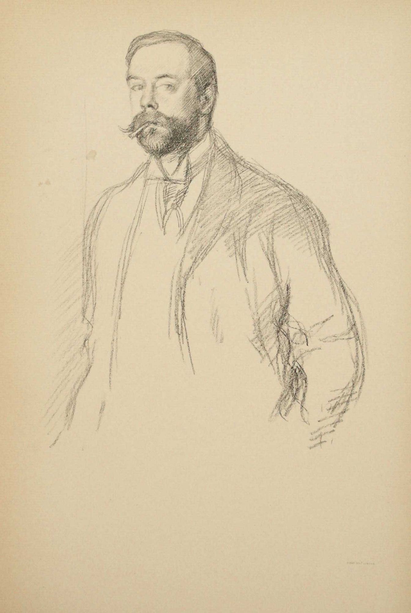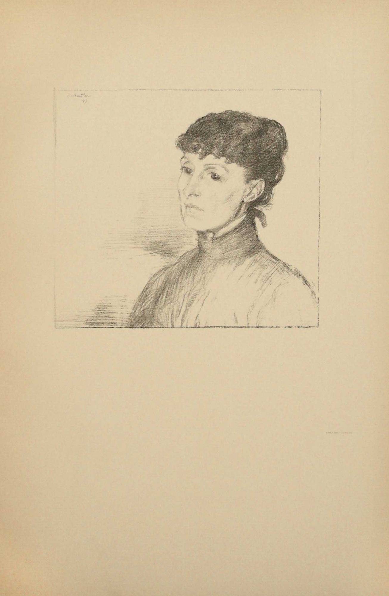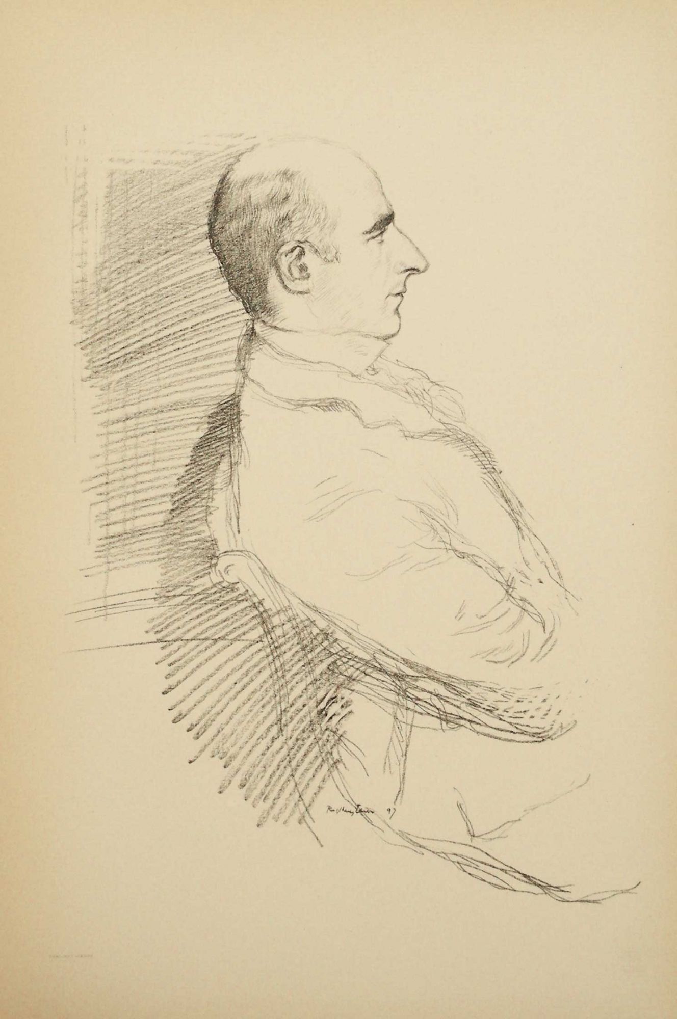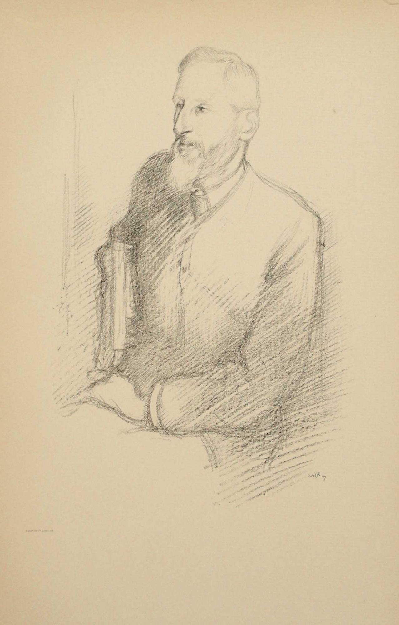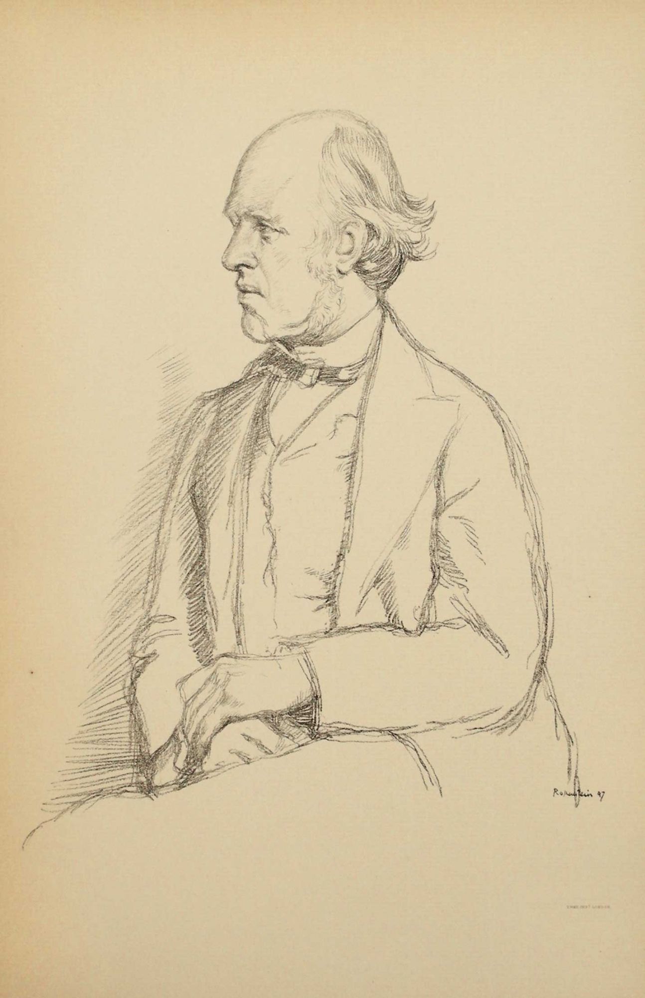 London: Grant Richards, 1898. Original Illustrations. Very Good. Original Illustrations. Scarce. 750 copies printed. These are the disbound pages from English Portraits, with seventeen of Will Rothenstein’s twenty-four lithographs of well-known persons of his day, along with a page of complimentary comments about each person. Rothenstein (1872-1945) was famous for his portraits, and painted Albert Einstein, T.S. Eliot, Thomas Hardy, W.B. Yeats, and Oscar Wilde among many others. Both his painted works and his prints display his great sensitivity and artistic mastery. He was also a friend to many prominent figures of his day, including Max Beerbohm, Joseph Conrad, and H.G. Wells. This group from English Portraits are as follows: Charles Ricketts and Charles Shannon, Sir Frederick Pollock, Thomas Hardy, Sir F. Seymour Haden, William Archer, The Right Rev. Dr. Creighton, The Marchioness of Granby (Violet Lindsay), The Right Hon. W.E.H. Lecky, John Singer Sargent, Arthur Wing Pinero, William Ernest Henley, Sidney Colvin, George Bernard Shaw, Alice Meynell (2 copies), Grant Allen, and Henry James. Each leaf measures 10 x 14.5 inches. The title page and table of contents page are also included. Some browning, closed tears, and light chipping, particularly to the page margins, but the lithographs are generally in quite nice condition. ART/011712.