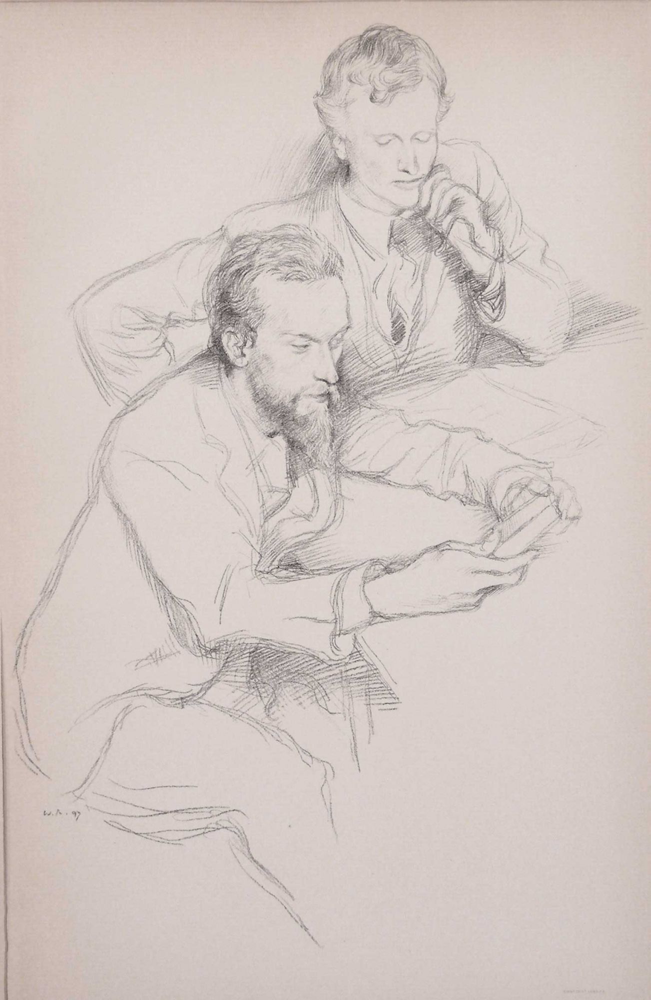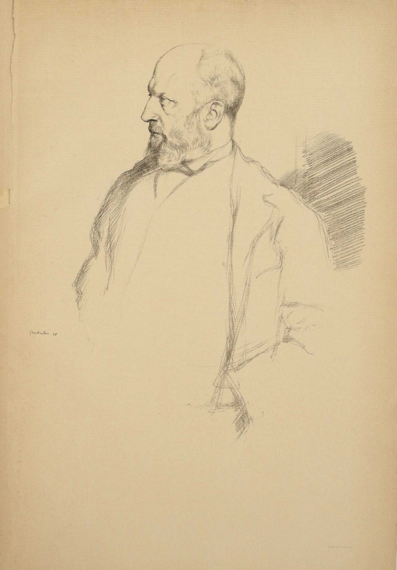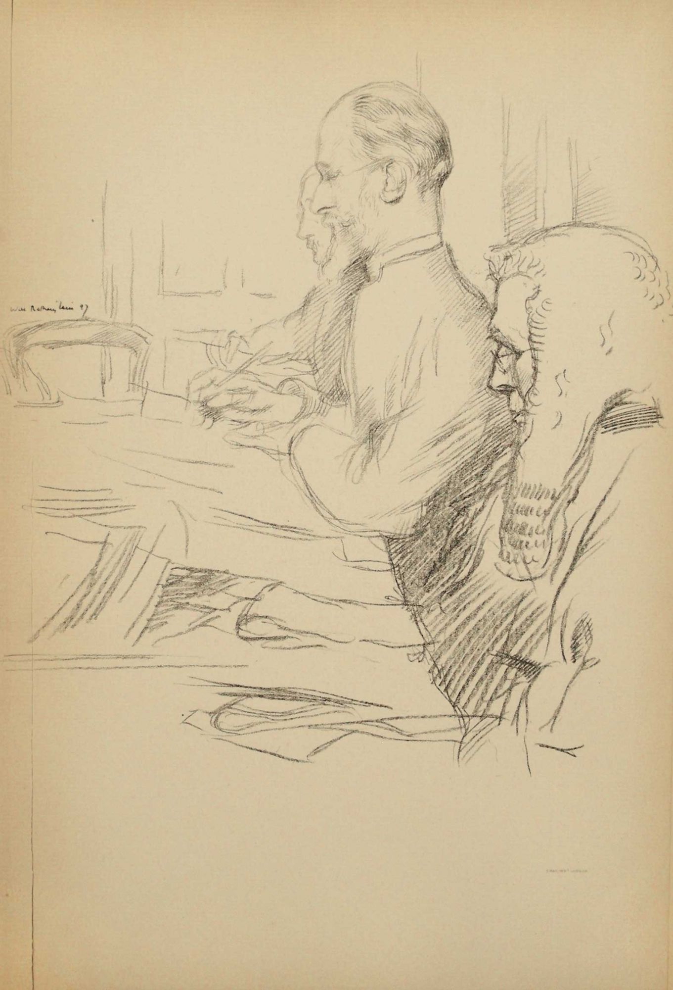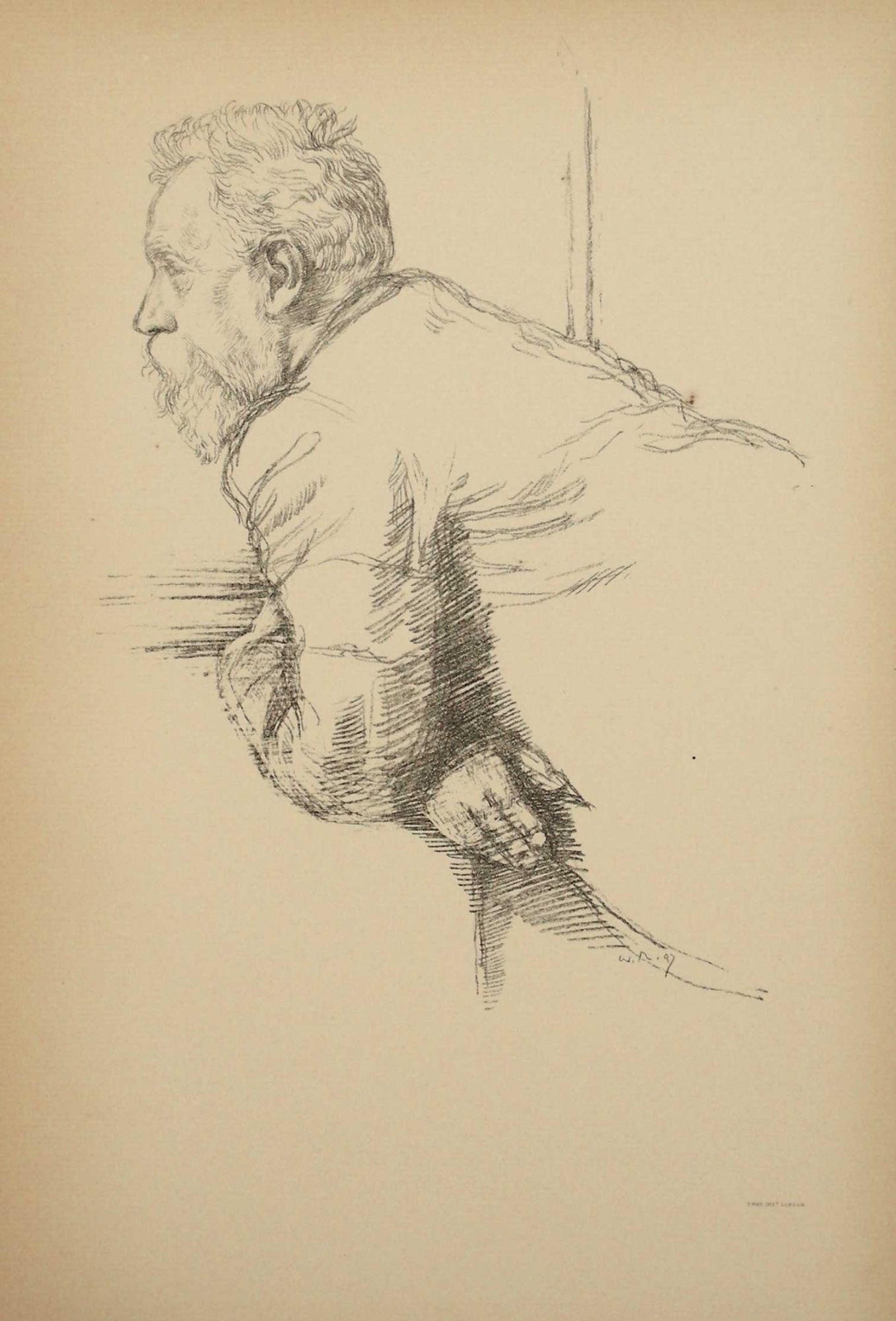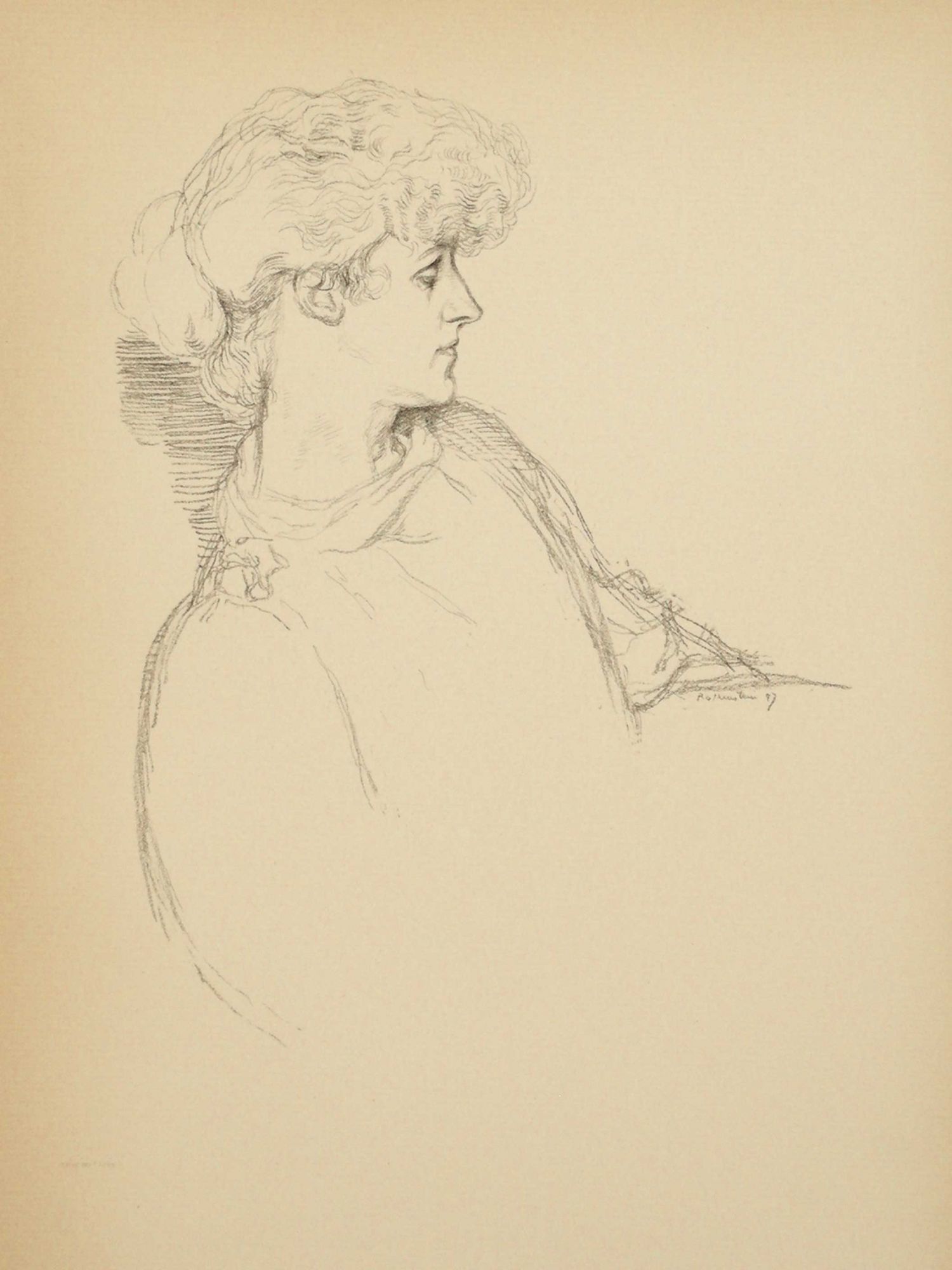 London: Grant Richards, 1898. Original Illustrations. Very Good. Original Illustrations. Scarce. 750 copies printed. These are the disbound pages from English Portraits, with seventeen of Will Rothenstein’s twenty-four lithographs of well-known persons of his day, along with a page of complimentary comments about each person. Rothenstein (1872-1945) was famous for his portraits, and painted Albert Einstein, T.S. Eliot, Thomas Hardy, W.B. Yeats, and Oscar Wilde among many others. Both his painted works and his prints display his great sensitivity and artistic mastery. He was also a friend to many prominent figures of his day, including Max Beerbohm, Joseph Conrad, and H.G. Wells. This group from English Portraits are as follows: Charles Ricketts and Charles Shannon, Sir Frederick Pollock, Thomas Hardy, Sir F. Seymour Haden, William Archer, The Right Rev. Dr. Creighton, The Marchioness of Granby (Violet Lindsay), The Right Hon. W.E.H. Lecky, John Singer Sargent, Arthur Wing Pinero, William Ernest Henley, Sidney Colvin, George Bernard Shaw, Alice Meynell (2 copies), Grant Allen, and Henry James. Each leaf measures 10 x 14.5 inches. The title page and table of contents page are also included. Some browning, closed tears, and light chipping, particularly to the page margins, but the lithographs are generally in quite nice condition. ART/011712.