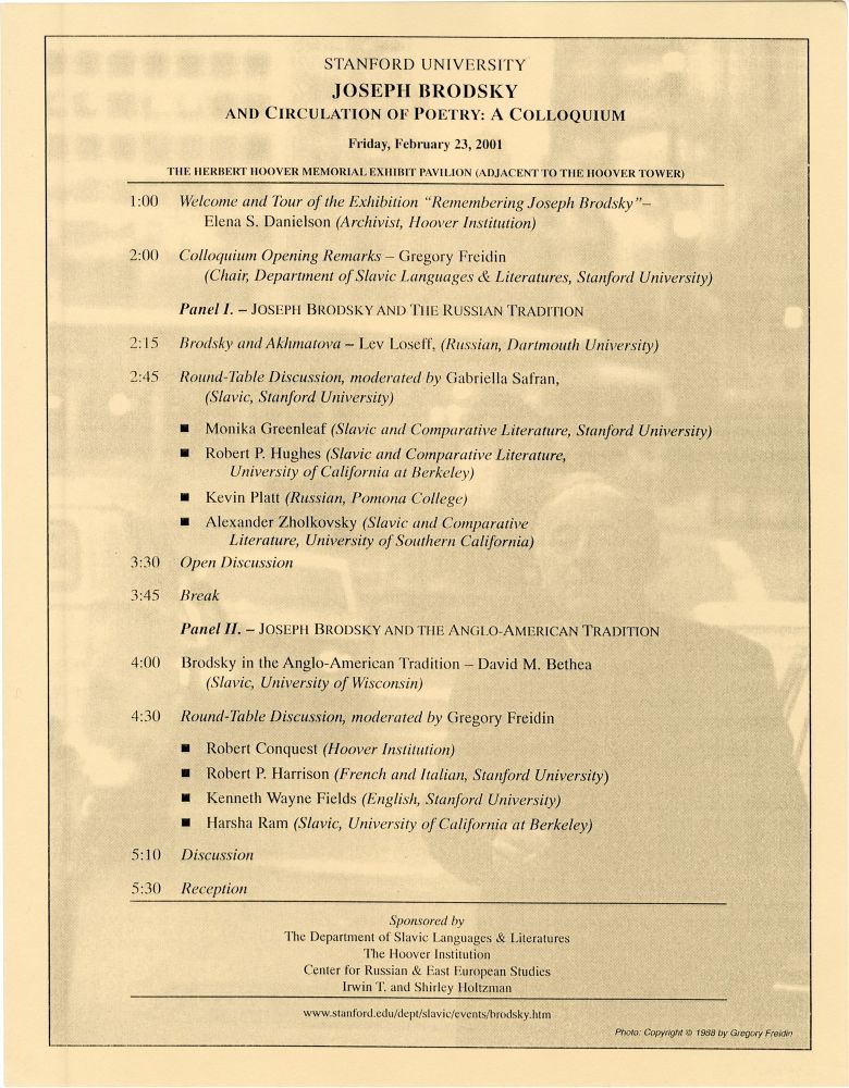 Stanford, CA: Stanford University, 2001. Poster advertising a colloquium on Joseph Brodsky at Stanford University on Friday February 23, 2001. Topics include "Joseph Brodsky and the Russian Tradition" and "Joseph Brodsky and the Anglo-American Tradition."