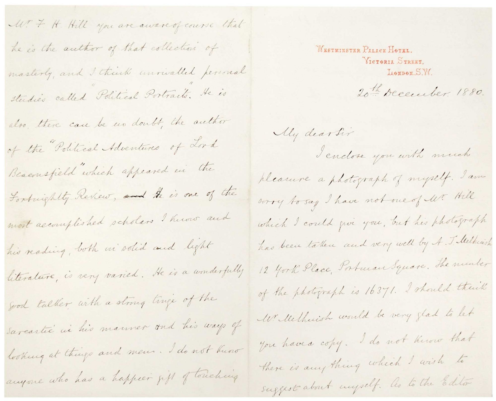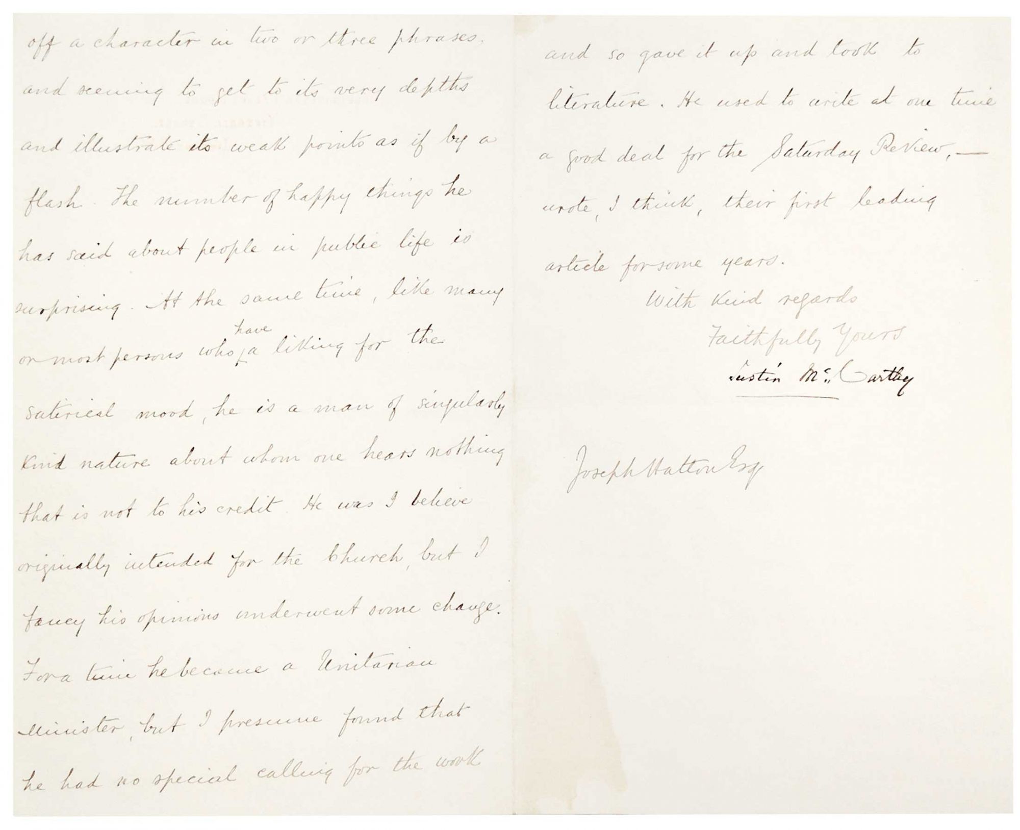 London, 1880. Manuscript material. Very Good. Manuscript material. An interesting four page letter written by Justin McCarthy to Joseph Hatton, sent from Westminster Palace Hotel, Victoria Street on 20 December 1880. This appears to be from the Justin McCarthy (1830-1912) who was a member of parliament, journalist, and author, who wrote for many years for the Daily News. Joseph Hatton (1841-1907) was a journalist and novelist who was editor of the Sunday Times from 1874-1881. In the letter, Mr. McCarthy first writes that he is enclosing with pleasure a photograph of himself, but was not able to provide one of Mr. Hill. He tells Hatton that he could get one from the photographer and gives the photograph number. He then goes on to write about Mr. Hill, who was Frank Harrison Hill, a writer and the editor in chief of the London Daily News. from 1870-1886. McCarthy writes ..."you are aware of course that he is the author of that collection of masterly, and I think unrivalled personal studies called "Political Portrais." He is also, there can be no doubt, the author of the "Political Adventures of Lord Beaconssfield" whilc appeard in the Fortnightly Review (, "and" crossed out) He is one of the most accomplished scholars I know and his reading, both in solid and light literature, is very varied. He is a wonderfully good talker with a strong tinge of the sarcastic.... I do not know anyone who has a happier gift of touching off a character in two or three phrases....The number of happy things he has said about people in public life is surprising....He was I believe originally intended for the Church, but I fancy his opinions underwent some change. For a time he became a Unitarian minister, but I presume found that he had no special calling for the work and so gave it up and took to literature.....With kind regards Faithfully Yours Justin McCarthy. Quarto sheet folded. Some light marks not affecting the text on inside recto. Very good condition. ALS/020112.