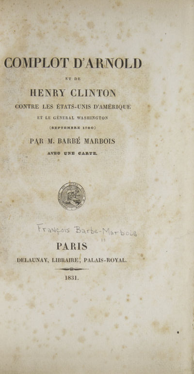 Paris, 1831. Two portraits and plan. xlvii, 163 pp. Contemporary blue paper wrappers; neatly rebacked, printed paper label. Modern bookplate on front pastedown. Some light foxing. Very good plus. Untrimmed and unopened. In a blue half morocco and cloth slipcase, spine gilt. Two portraits and plan. xlvii, 163 pp. Second edition, after the first of 1816, of this study of the treachery of Benedict Arnold. The portraits are of Arnold and George Washington, and the plan is of "des Forts, Batteries et Poste de West-Point 1780." Howes B114; Sabin 3302