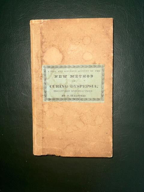 12mo, original boards with tan spine and paper label on top cover, 155 pp. Binding is worn a bit at the extremities, back hinge a little cracked, but still firm, some staining and soiling to covers, worm hole in first few leaves, not affecting text, partially uncut, foxing throughout, but more in the first and last leaves; still a tight copy, and about very good. Halsted suffered from a digestive disorder for 25 years, and when he failed to get relief from dyspepsia through traditional medical practices he took matters into his own hands. He studied the affects of his disorder, and came up with a cure that involved diet and exercise. Considered a quack by some, he nevertheless claimed to find a cure. Part of his method was to get the stomach muscles to relax, one of his suggestions for achieving this end was to cover the abdomen "with a common bread and milk poultice" about three times a day. He also advises one to eat slowly, moderately and at regular intervals. Halsted indicates exercising regularly, which pumps more blood into the muscles, and improves there condition, was crucial to promoting better digestive health.