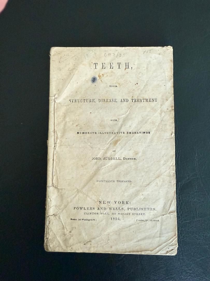 Pamphlet, 8vo, illustrated, 72, [11 book ads] pp. Lacks front wrapper, but otherwise complete, title soiled a bit with a few chips or tears at the extremities, not affecting text, contents page creased, some corners with folds and small tears, normal aging; quite good internally. Early, and somewhat scarce dental title, which was probably first published in 1847. Burdell covers everything from the role of temporary teeth to the effects of artificial food. This work provides a very useful picture of the state of dentistry in the mid 19th century, which includes 44 nicely done illustrations. The last 11 pages are a catalogue of medical books for sale on phrenology, hydropathy, physiology, and psychology. #100968