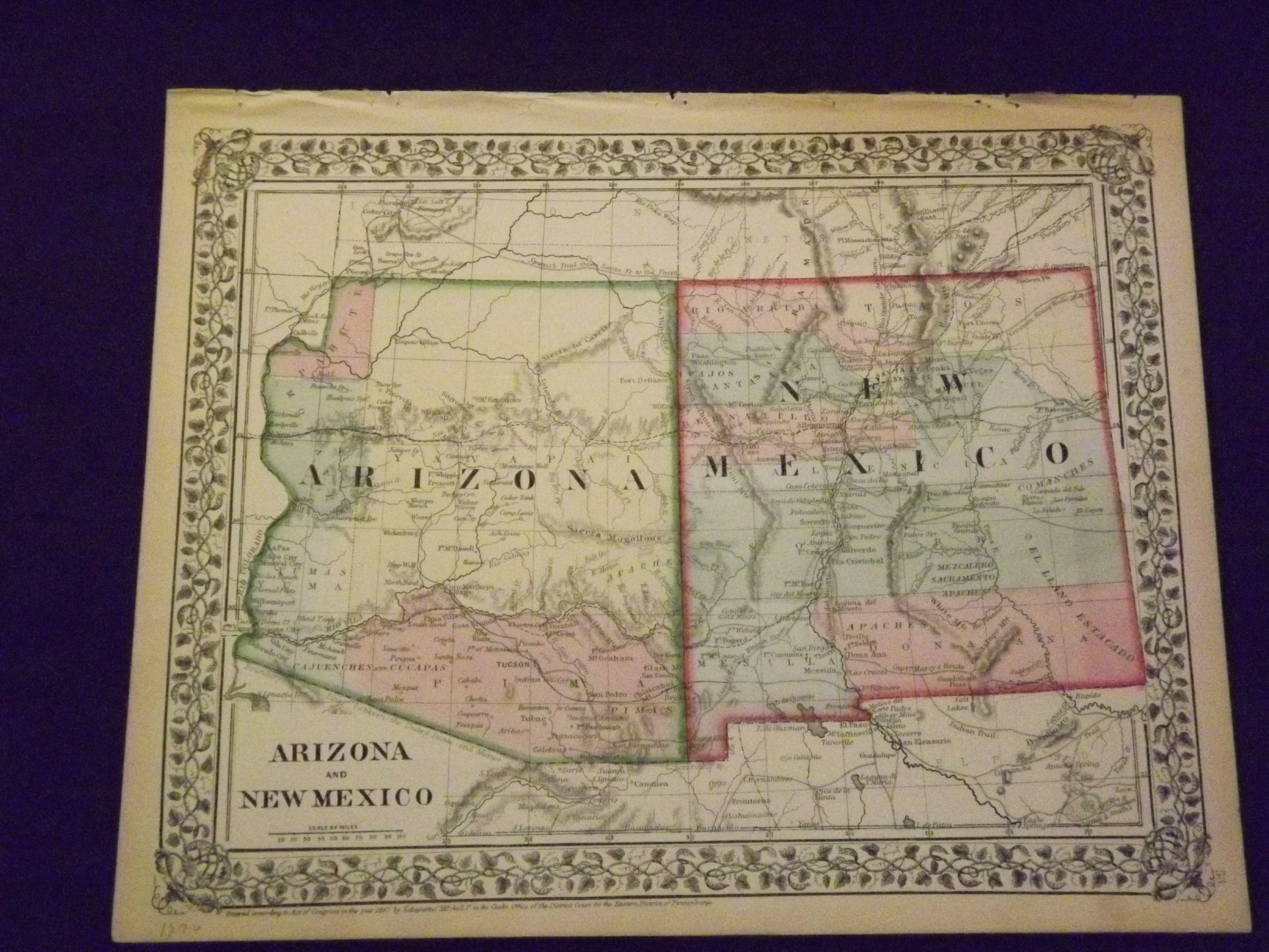 Unbound, colored engraved map, decorative boarder, 14 "x 11". Slight toning and aging, a few small chips in margins; overall bright and clear and in very good shape. Maps are wrapped with acid free board, or in rigid sleeves. The Mitchell family started to produce atlases in 1846, and continued into the early 1890s. Around 1860, S. Augustus Mitchell Jr. took over, and the atlas would be called Mitchell's New General Atlas. This is a bright and attractive map of two western states from the 1870 installment of that atlas. A little of the Colorado river can be seen, and the Apache Territory is featured in this map. Ristow 311-313