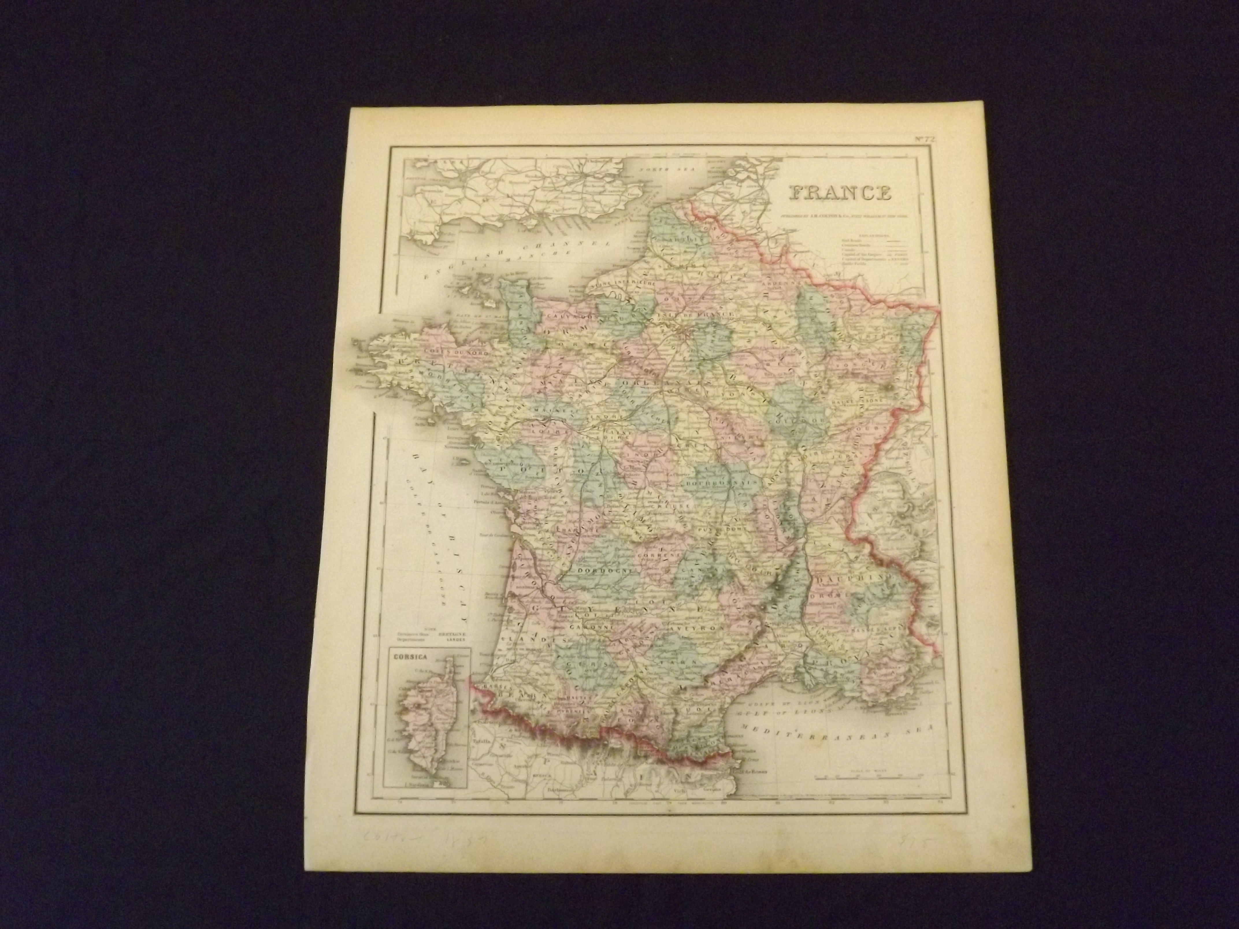 New York: Colton J.H., 1857. Unbound, colored engraved map, decorative boarder, 16"x 13". Slight toning and aging; overall bright and clean and in very good condition. Maps are wrapped with acid free board, or in rigid sleeves. Beginning with J. H. Colton (1800-1893), the Colton family published atlases for over 30 years. Colton's Atlas of the World was first published in 1855 in a large two volume set. In 1857 it became Colton's General Atlas, and Colton's sons, George Woolworth and Charles B. would take over the business. This map of France is from the rather scarce 1857 edition of Colton's General Atlas. The map is colorful, and includes a small inset map of Corsica. May require extra postage. Ristow 313-326