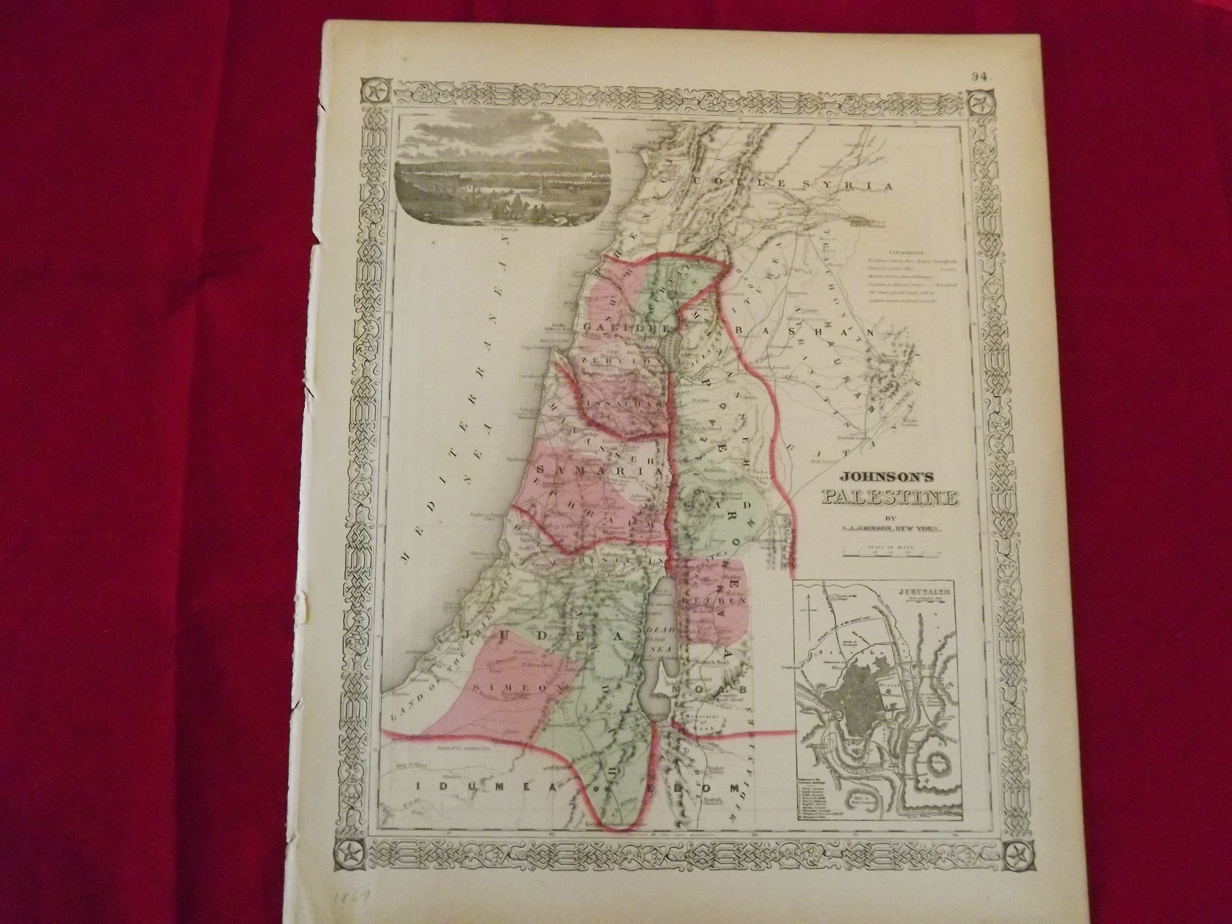 New York: A.J. Johnson, 1867. Unbound, colored engraved map, decorative boarder, 16" x13". Slight toning and aging, a few of chips at the edge of a very ample margin; otherwise bright and clean and in very nice condition. Alvin Jewett Johnson (1827-1884) appears to have entered the map publishing business in 1860. It appears that he obtained J.H. Colton's map copyrights, and published the first installment of the Johnson's New Illustrated (Steel Plate) Family Atlas In that year. Many of the maps Johnson would use would bear the J.H. Colton copyright for many years. Johnson's Atlas would run from 1860 to 1885. While Johnson would use somewhat similar boarder designs, map coloring would appear a little heavier than the earlier Colton maps. This map of Palestine is from the 1867 edition of Johnson's Illustrated Family Atlas. The map has good color, and features an engraving of Damascus and an inset map of Jerusalem detail. Ristow 325-326