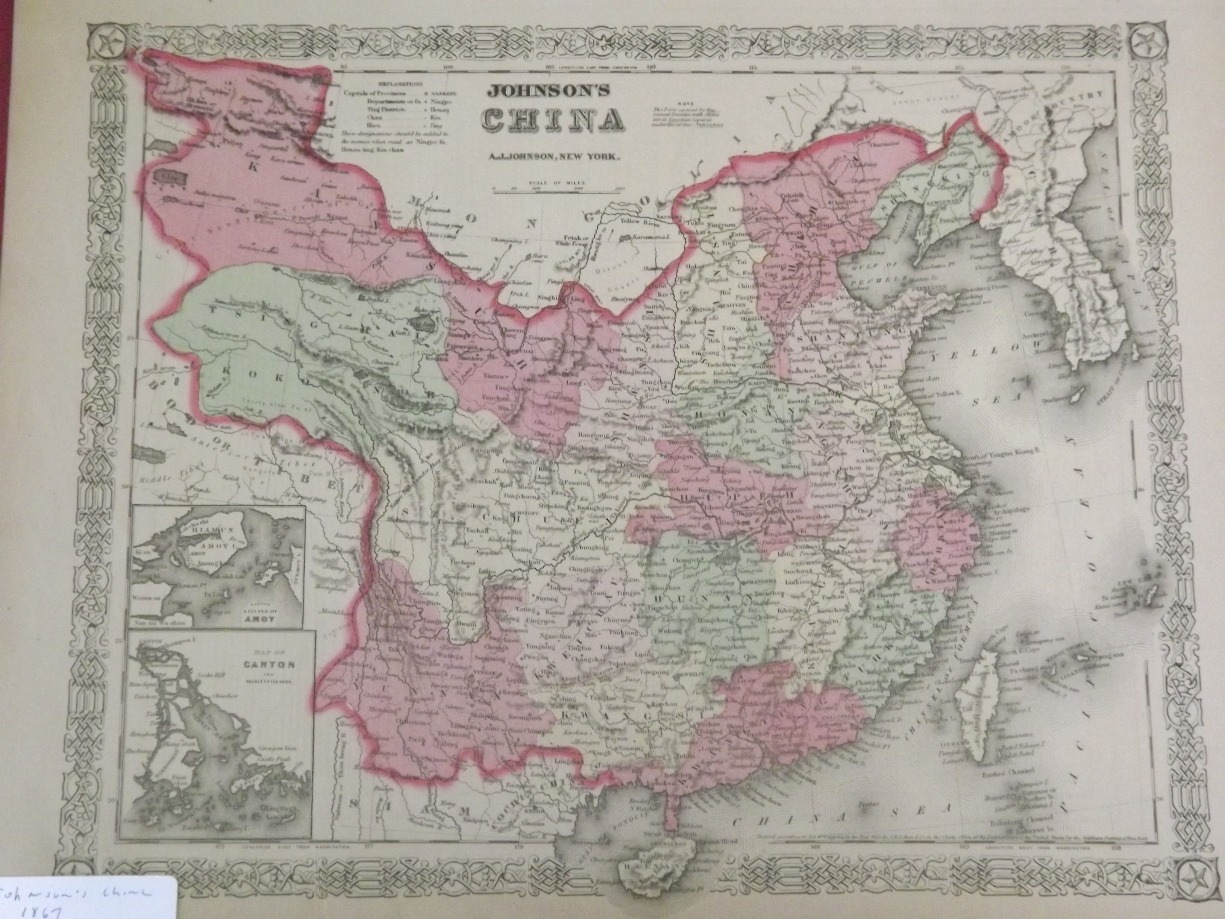 New York: A.J. Johnson, 1867. Unbound, colored engraved map, decorative boarder, 16" x13". Slight toning and aging, a couple of chips at the edge of a very ample margin; otherwise bright and clean and in very nice condition. Alvin Jewett Johnson (1827-1884) appears to have entered the map publishing business in 1860. It appears that he obtained J.H. Colton's map copyrights, and published the first installment of the Johnson's New Illustrated (Steel Plate) Family Atlas In that year. Many of the maps Johnson would use would bear the J.H. Colton copyright for many years. Johnson's Atlas would run from 1860 to 1885. While Johnson would use somewhat similar boarder designs, map coloring would appear a little heavier than the earlier Colton maps. This map of China is from the 1867 edition of Johnson's Illustrated Family Atlas, and has nice coloring and substantial detail. The J.H. Colton 1855 copyright still appears on this map. May require extra postage. Ristow 325-326