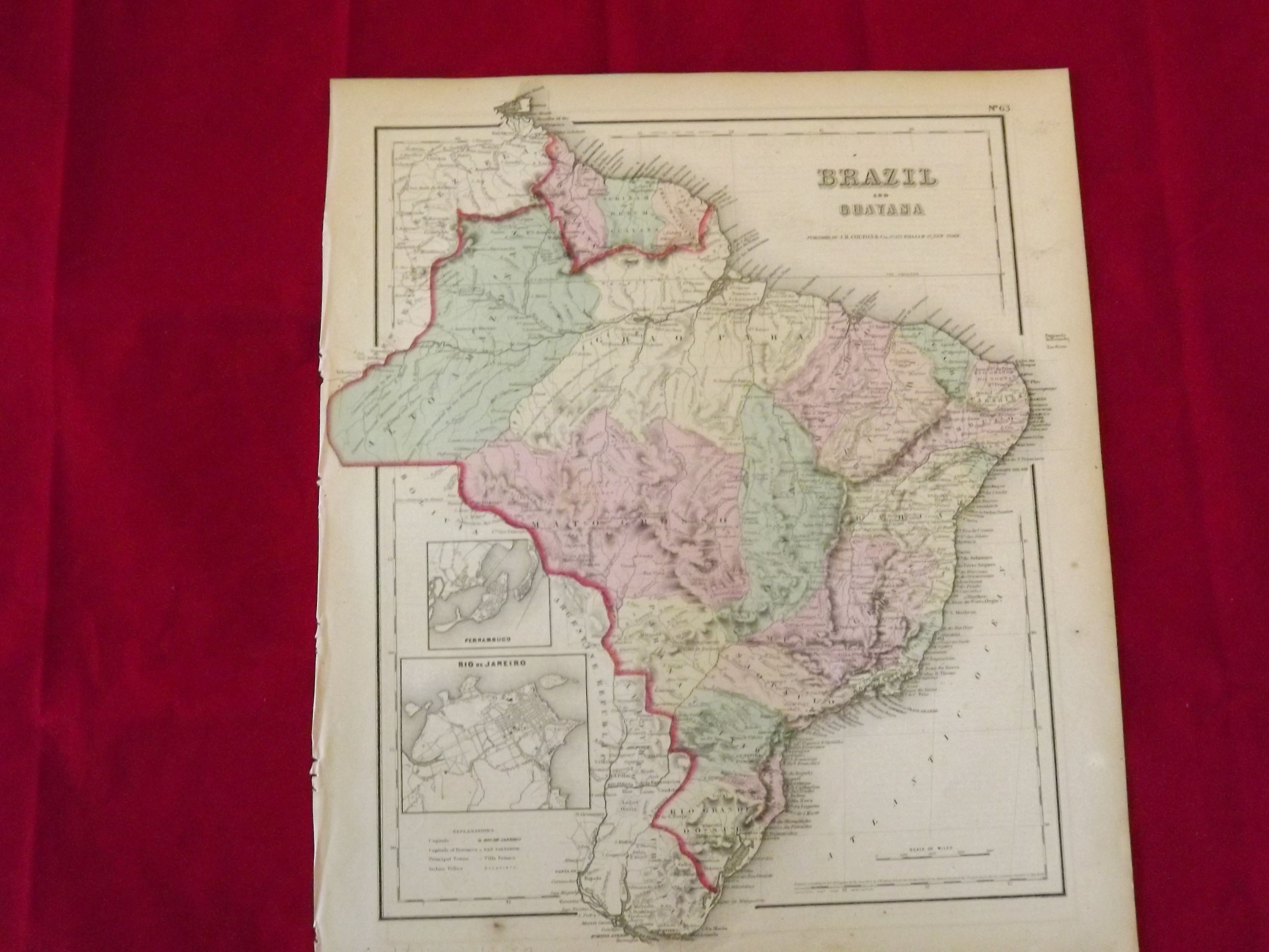 New York: Colton J.H., 1857. Unbound, colored engraved map, 16"x 13". Slight toning and aging; overall bright and clean and in very good condition. Maps are wrapped with acid free board, or in rigid sleeves. Beginning with J. H. Colton (1800-1893), the Colton family published atlases for over 30 years. Colton's Atlas of the World was first published in 1855 in a large two volume set. In 1857 it became Colton's General Atlas, and Colton's sons, George Woolworth and Charles B. would take over the business. This is an attractive map of Brazil from the rather scarce 1857 edition of Colton's General Atlas. J.H. Colton is named as the publisher on the map. The map is colorful, and includes a small inset map of Rio De Janeiro. Ristow 313-326