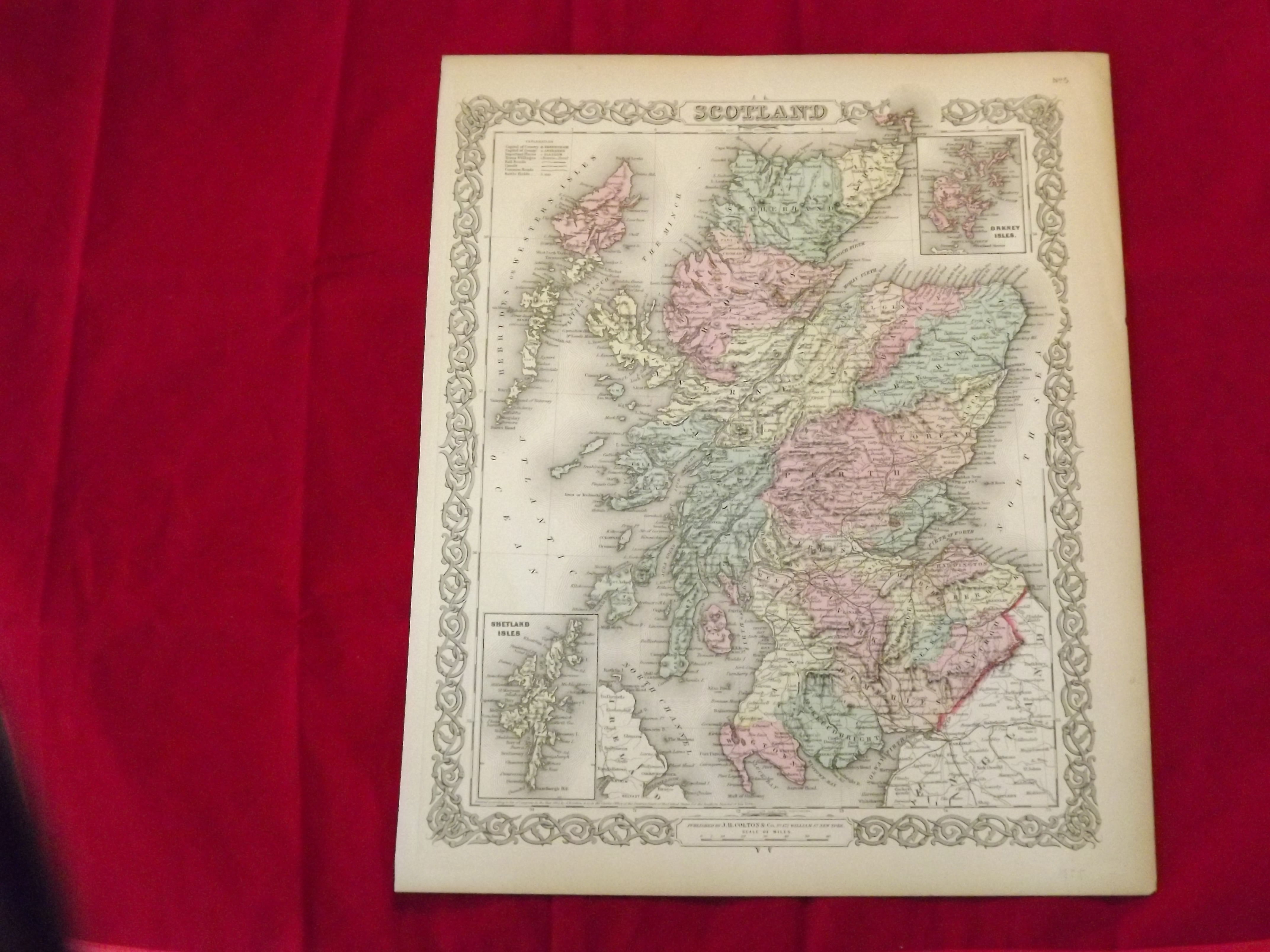 New York: Colton J.H., 1855. Unbound, colored engraved map, decorative boarder, 16"x 13". Slight toning and aging, a few margin chips, but margins are wide; overall bright and clean and in very good condition. Maps are wrapped with acid free board, or in rigid sleeves. Beginning with J. H. Colton (1800-1893), the Colton family published atlases for over 30 years. Colton's Atlas of the World was first published in 1855 in a large two volume set. In 1857 it became Colton's General Atlas, and Colton's sons, George Woolworth and Charles B. would take over the business. This map of Scotland is from the 1866 edition of Colton's Atlas of the World. The map is very colorful and crisp, and includes small inset maps of Shetland Isles and Orkney Isles. Ristow 313-326