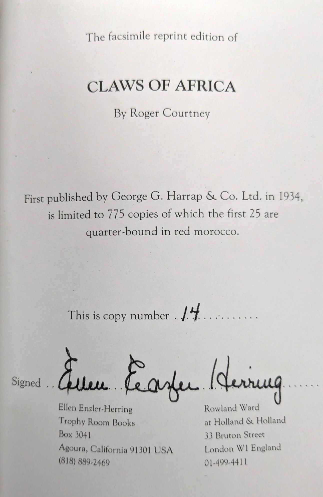 - Agoura, California and London, England: Ellen Enzler-Herring of Trophy Room Books and Rowland Ward of Holland & Holland
