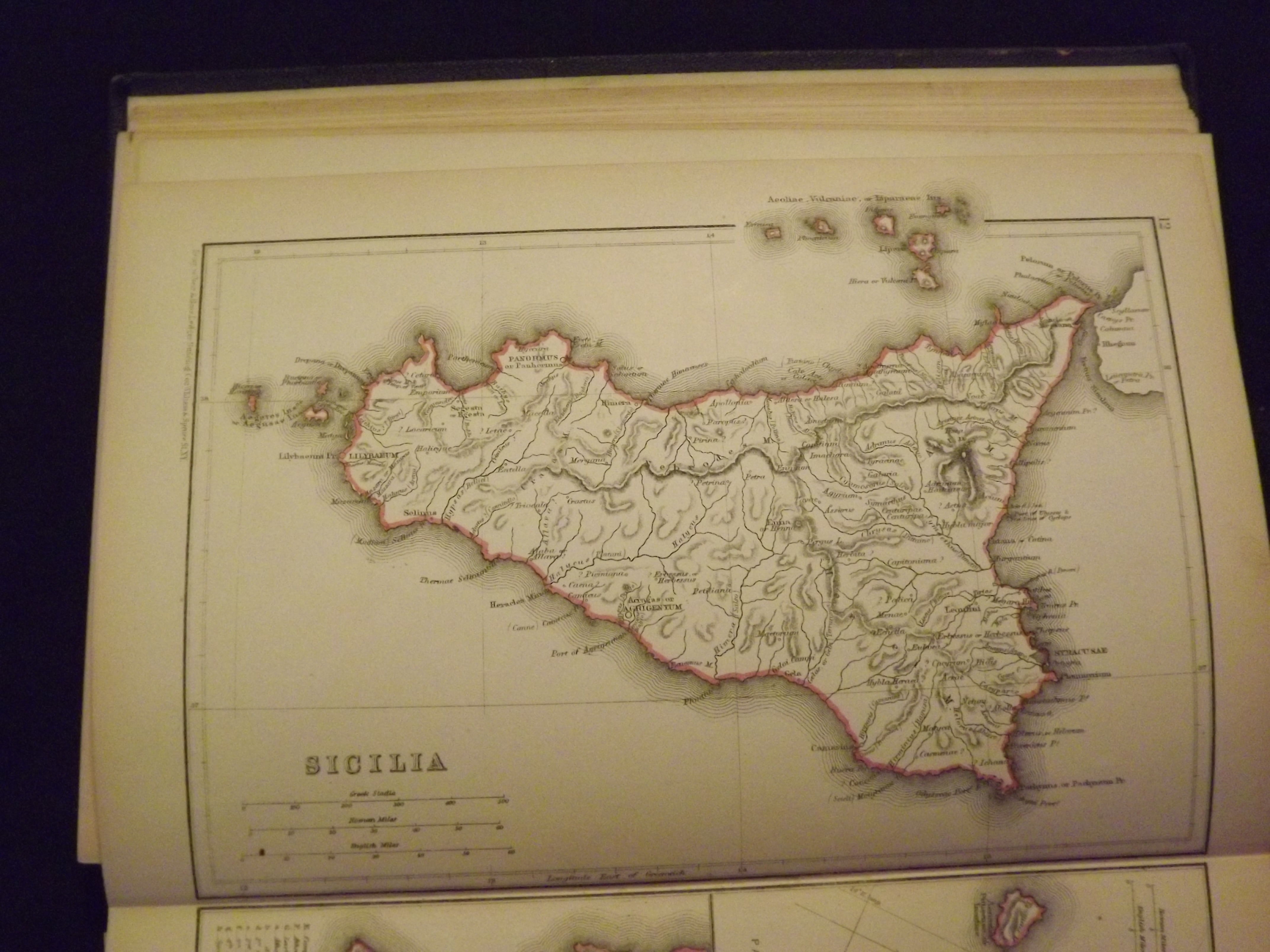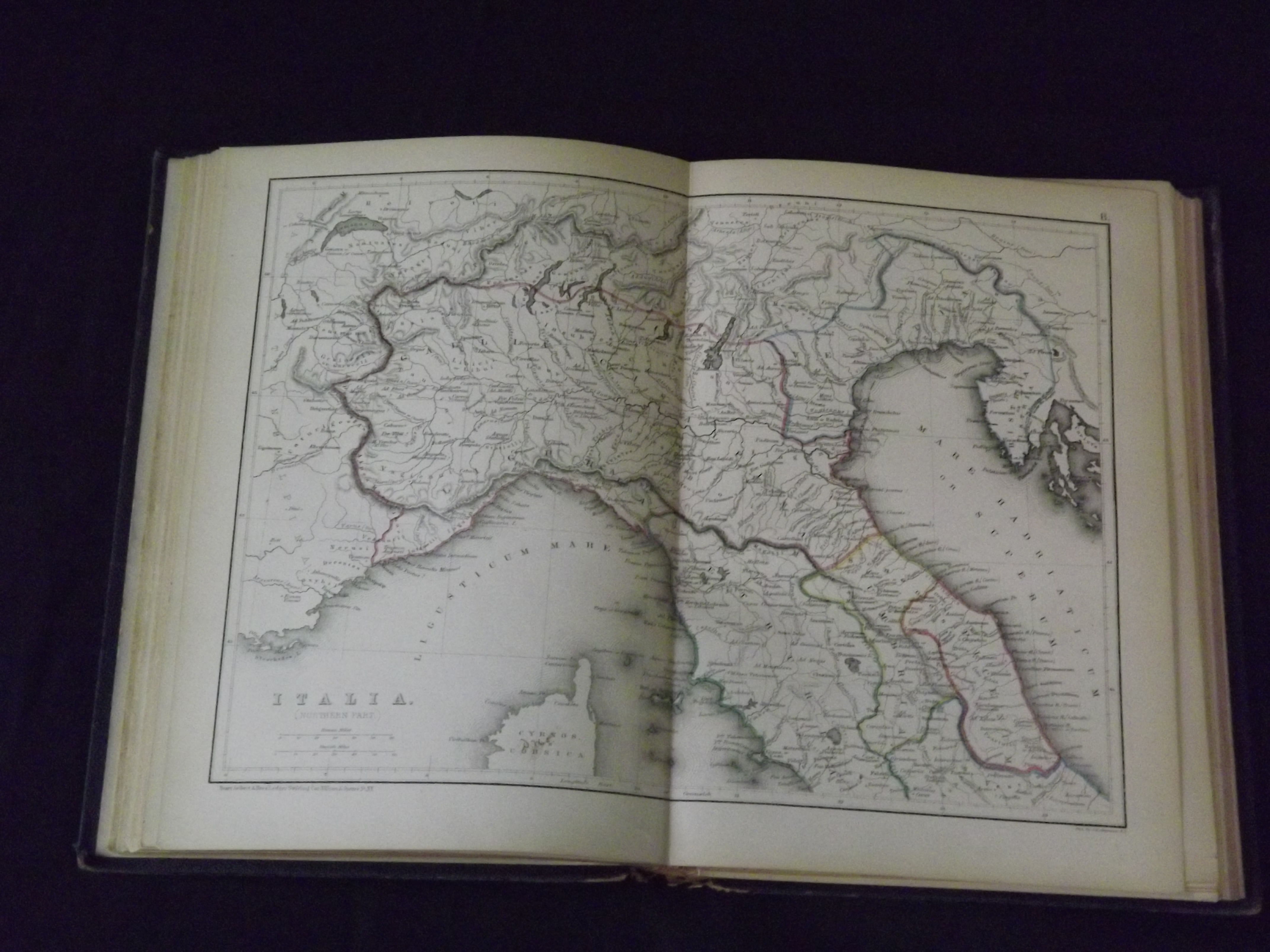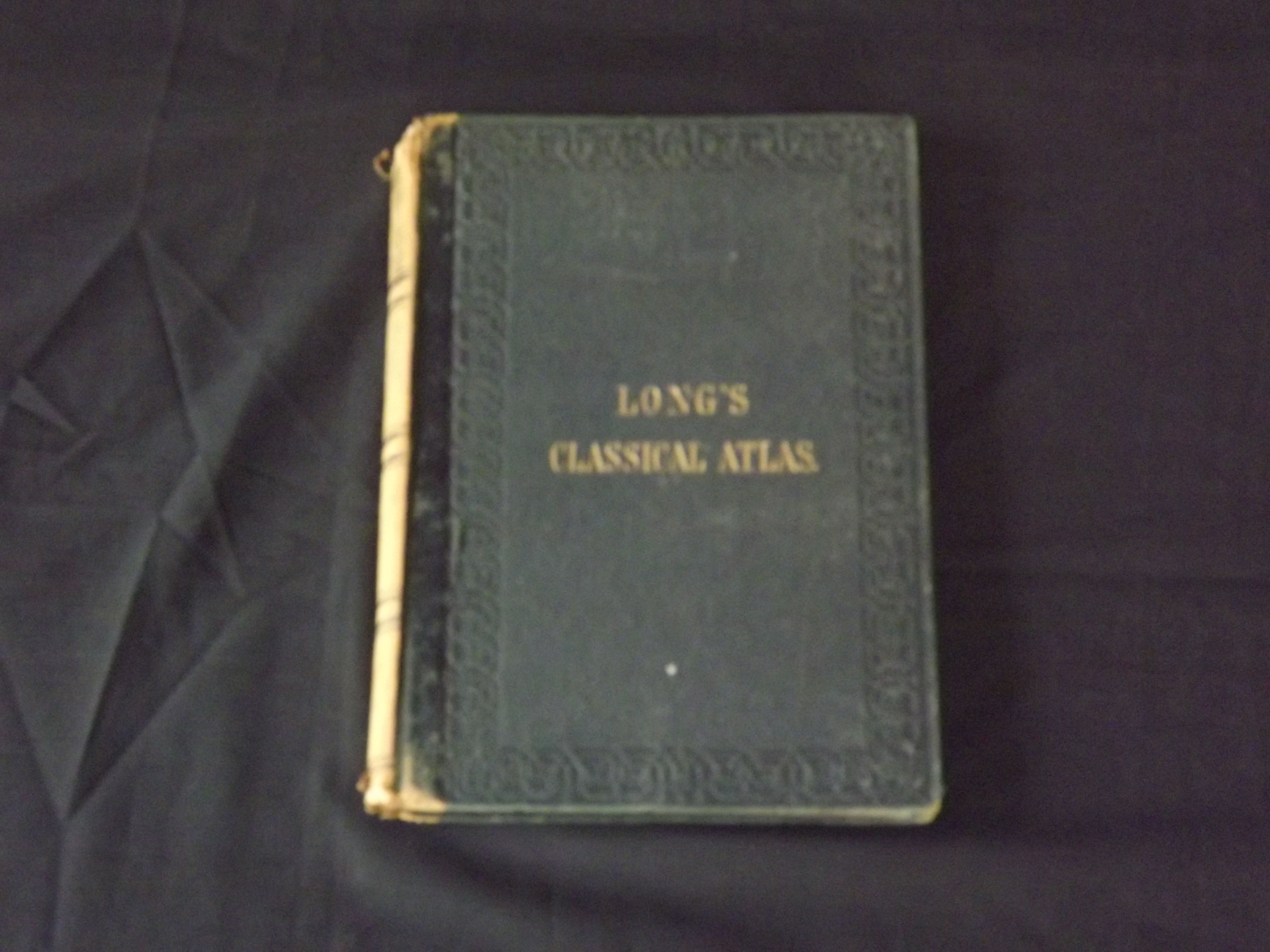 Small 4to, leather spine and cloth, with gilt lettering on front cover, 52 maps and plans on 26 plates, maps engraved and colored in outline. Binding somewhat loose, and spine is quite faded and worn and torn at the top, two maps are detached, owner's signature on front endpaper.; internally maps are fairly bright and clean. Otherwise known as "Long's Classical Atlas," this work includes many attractive classic double -page maps. Long includes The World Known by the Ancients, Alexander's Empire, the Provinces of Rome, Britannia, Italia, Sicilia, , Palestine, and Arabia.