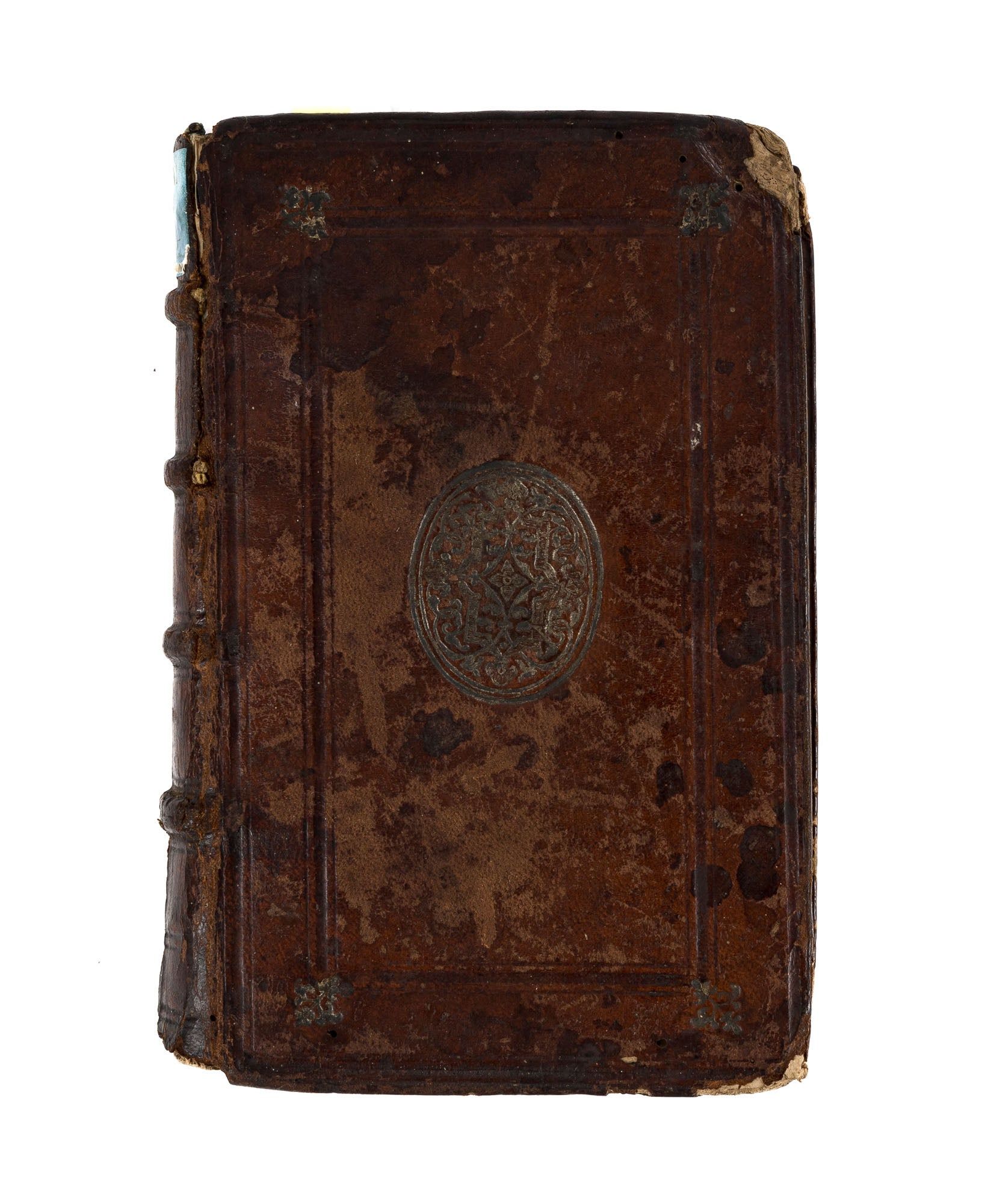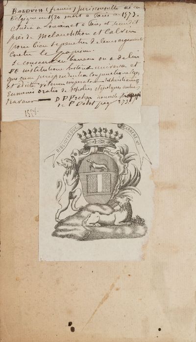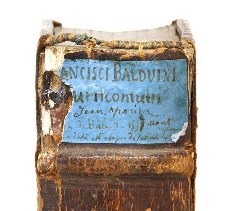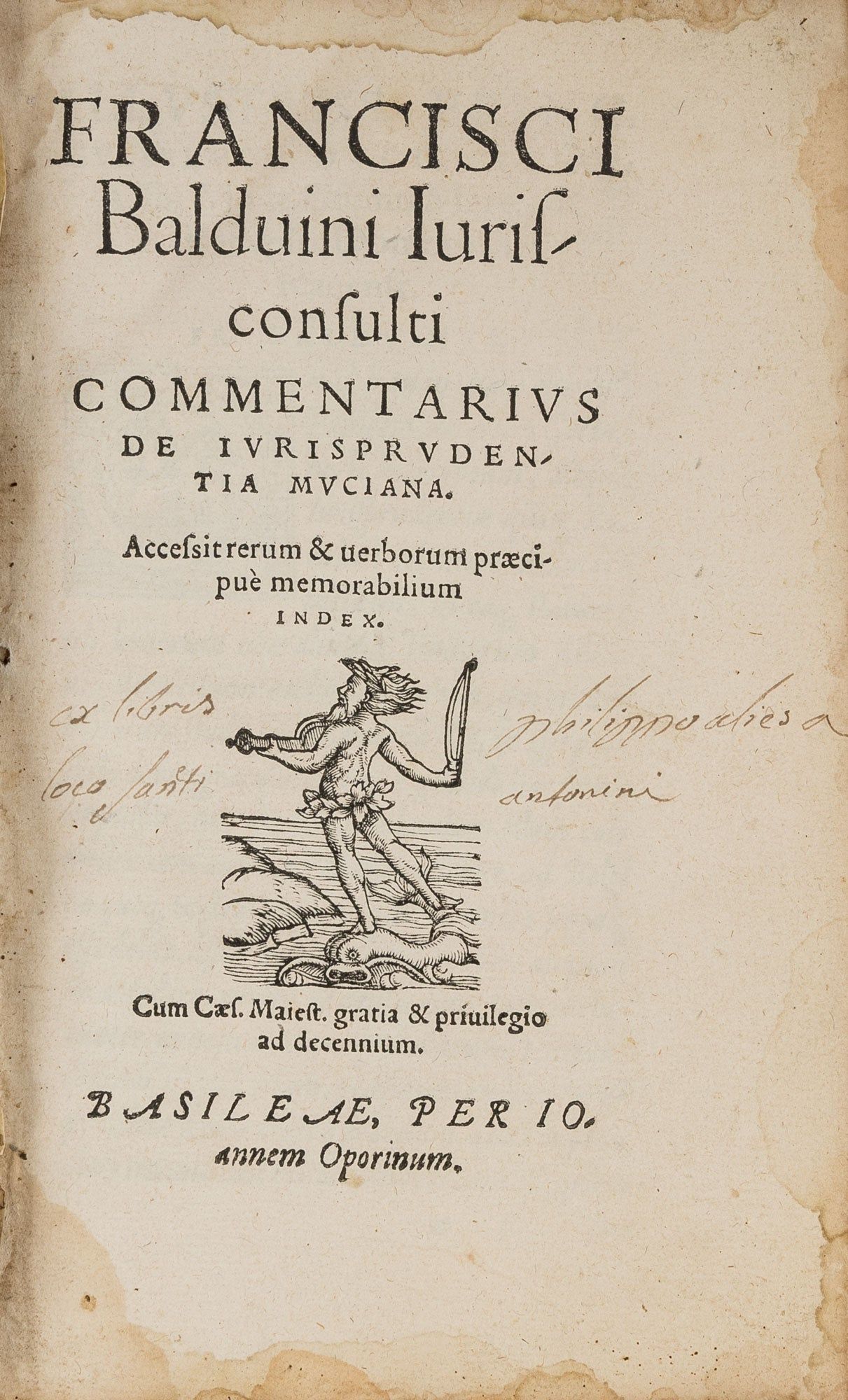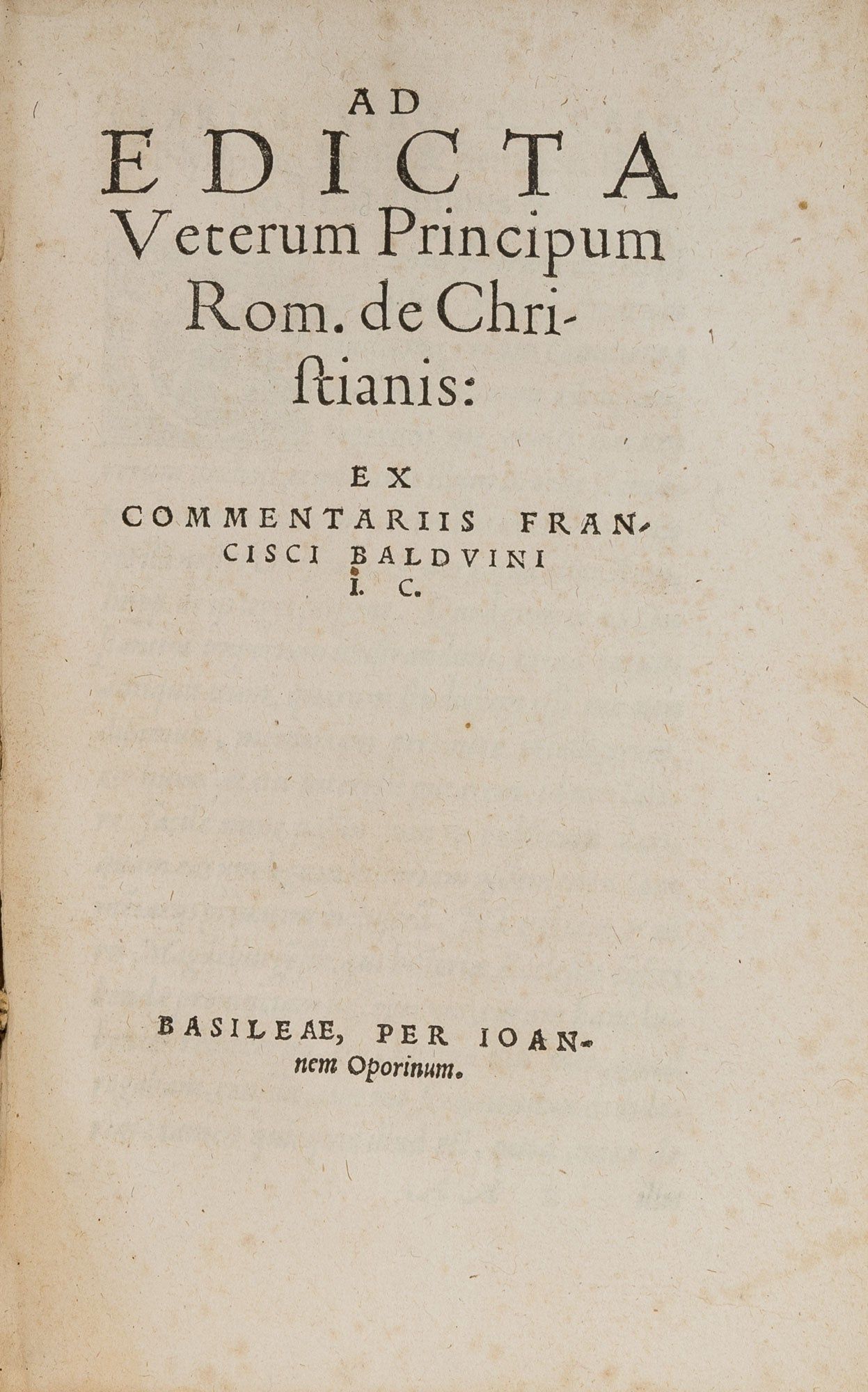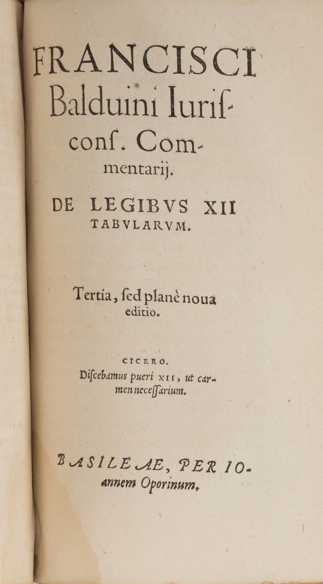 1557. De Legibus XII Tabularum. Tertia sed Plane nova.... De Legibus XII Tabularum. Tertia sed Plane nova. Three Works by an Important Humanist Scholar Baudouin, Francois [1520-1573]. Commentarius de Iurisprudentia Muciana. Accessit Rerum & Verborum Praecipue Memorabilium Index. Basel: Per Ioannem Oporinum, [1558]. [xvi], 306, [6] pp. [Bound with] Baudouin, Francois. De Legibus XII Tabularum. Tertia sed Plane Nova Editio. Basel: Per Ioannem Oporinum, [1557]. [viii], 252, [18] pp. [And] Baudouin, Francois, Commentary. Ad Edicta Veterum Principum Rom. de Christianis. Basel: Per Ioannem Oporinum, [c. 1557]. 122, [10] pp. Lacking leaves HH5 and HH6, the final text leaf (pp. 121-2) and the first index leaf. Octavo (7" x 4-1/2"). Contemporary calf, blind frames and central medallions to boards, raised bands, blind ornaments and later hand-lettered paper title label to spine. Some rubbing to boards, heavier rubbing to extremities with wear to spine ends and corners, joints starting at ends, hinges cracked but secure, later armorial bookplate ("Bibliotheque Hyacinthe Carrere") and tipped-in leaf of notes (presumably by Carrere) to front pastedown. Light toning to text, light foxing and dampstaining in places. Occasional notes and glosses in a contemporary hand, early owner inscription to title page, interior otherwise clean. $1,500. * Later editions. Baudouin was an eminent French humanist jurist and theologian. Interested in the early history of Roman law, he emphasized the importance of history in the development of the law. This volume collects two of his principal works, De Legibus XII Tabularum, a study of the history and significance of the Twelve Tables, and Commentarius de Iurisprudentia Muciana, a study of Roman law during the Republic. The final title addresses the legal status of the early Christian Church. Hyacinthe Carrere [1829-1904], a later owner of this volume, was a French notary clerk, historian and collector from Toulouse. Adams, Catalogue of Books Printed on the Continent of Europe, 1501-1600 B87, B93, B84.