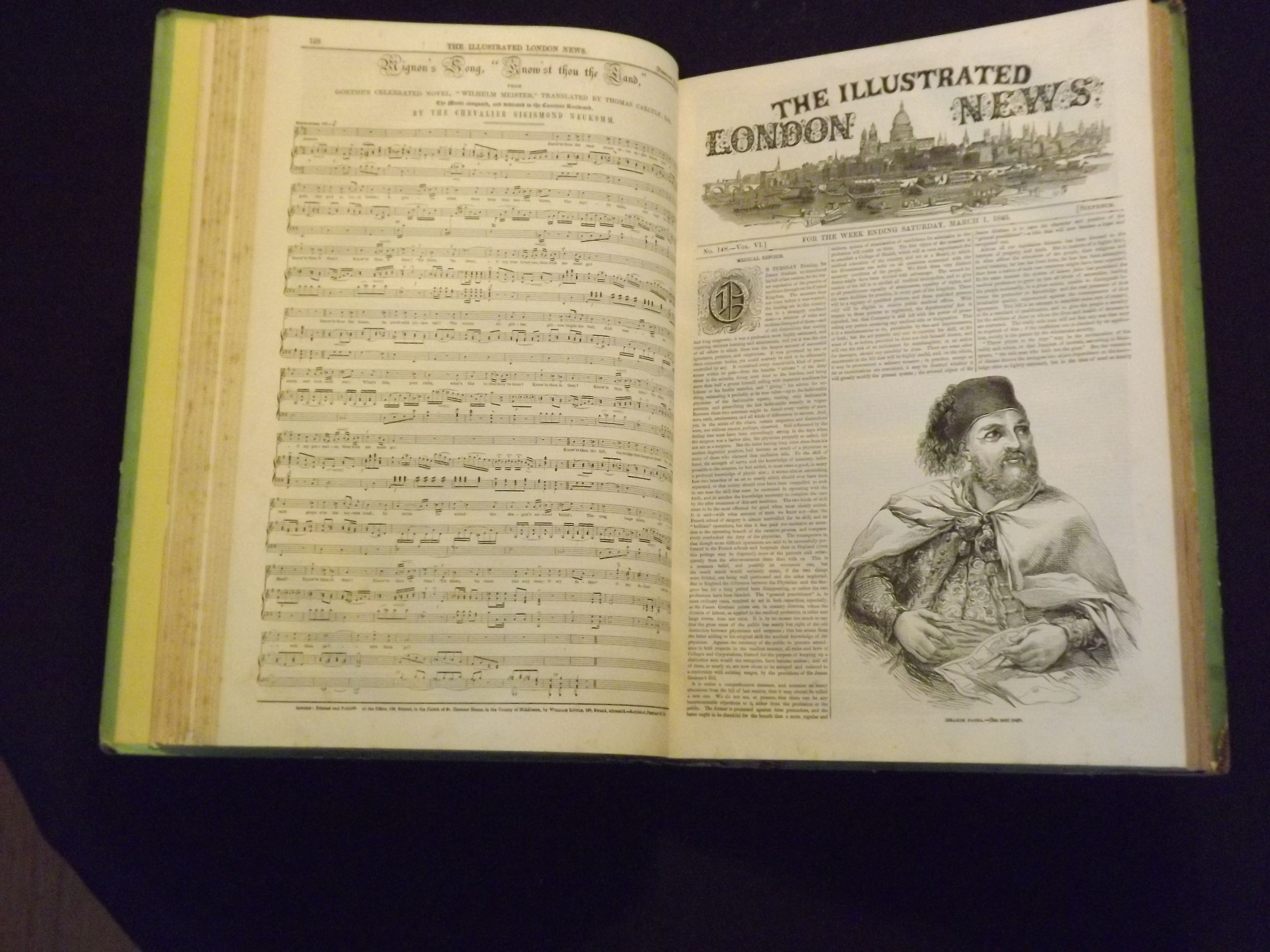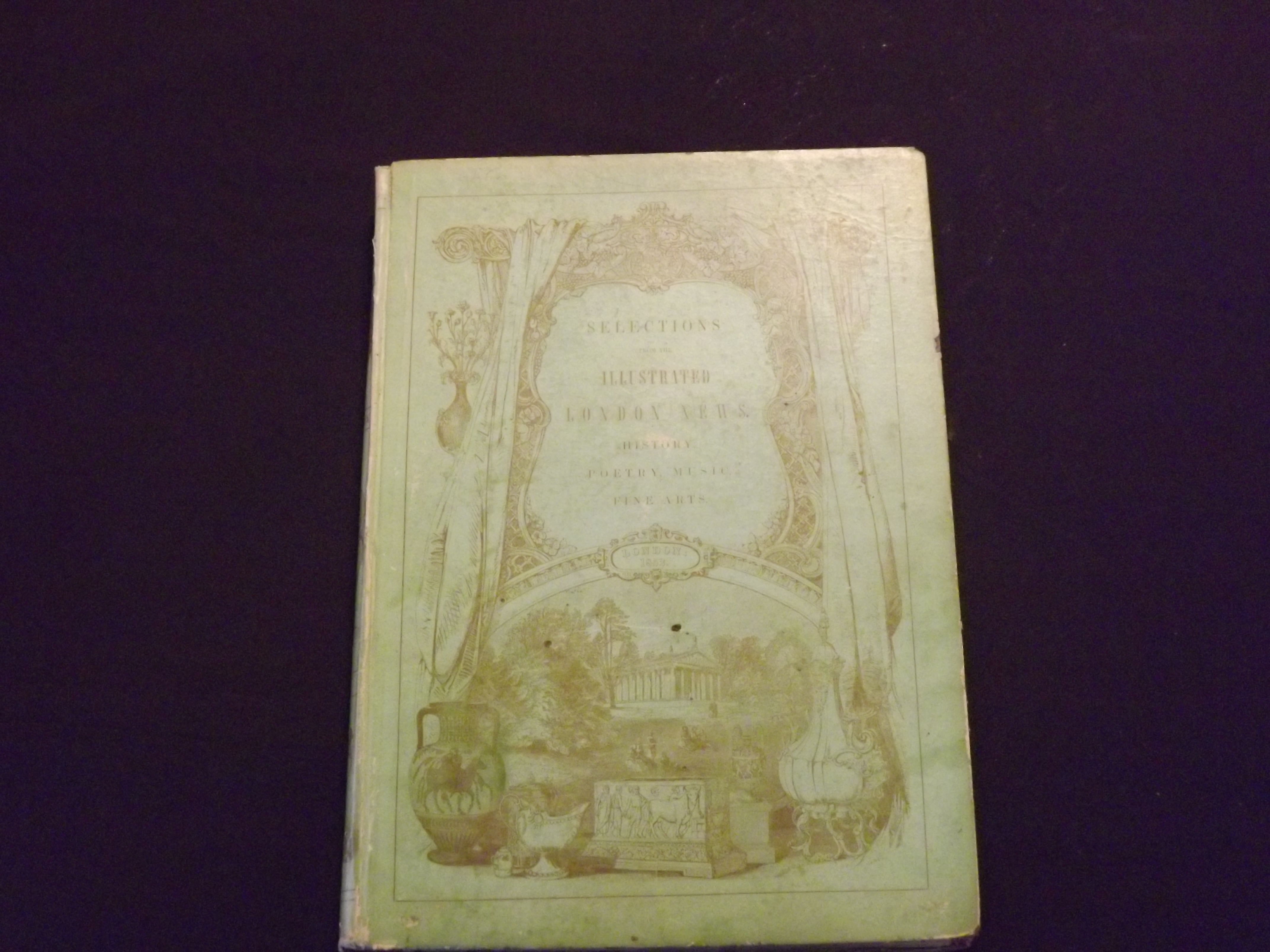 Folio (16" x 11 1/2") laminated mint green colored boards, illustrated. Binding with some chips and wear at extremities, small bookplate on front pastedown, endpaper torn, a couple of other pages with minor tears, not collated, but a couple of issues with a page missing, generally the contents seem complete), slight aging; otherwise very good. This is a collection of the Illustrated London News that was probably used to promote subscriptions. The date on the tile page indicates 1852, but the actual issues seem to run from December 7, 1844 to July 5, 1845. This volume contains about twenty issues, during that period, but does not include every issue. In some of these promotional collections, some issues are reprinted, but the reprints are from 1852. A couple of pages are missing, but the issues seem mostly complete. This volume was put out about ten years after the Illustrated London News began publication in May 1842. It contains some very interesting news and illustrations, including an illustration of an 'electric telegraph' in the April12, 1845 issue, a very young Queen Victoria and Prince Albert engraving at a costume ball in the June 7, 1845 issue, and a tennis match in the February 1, 1845 issue.
