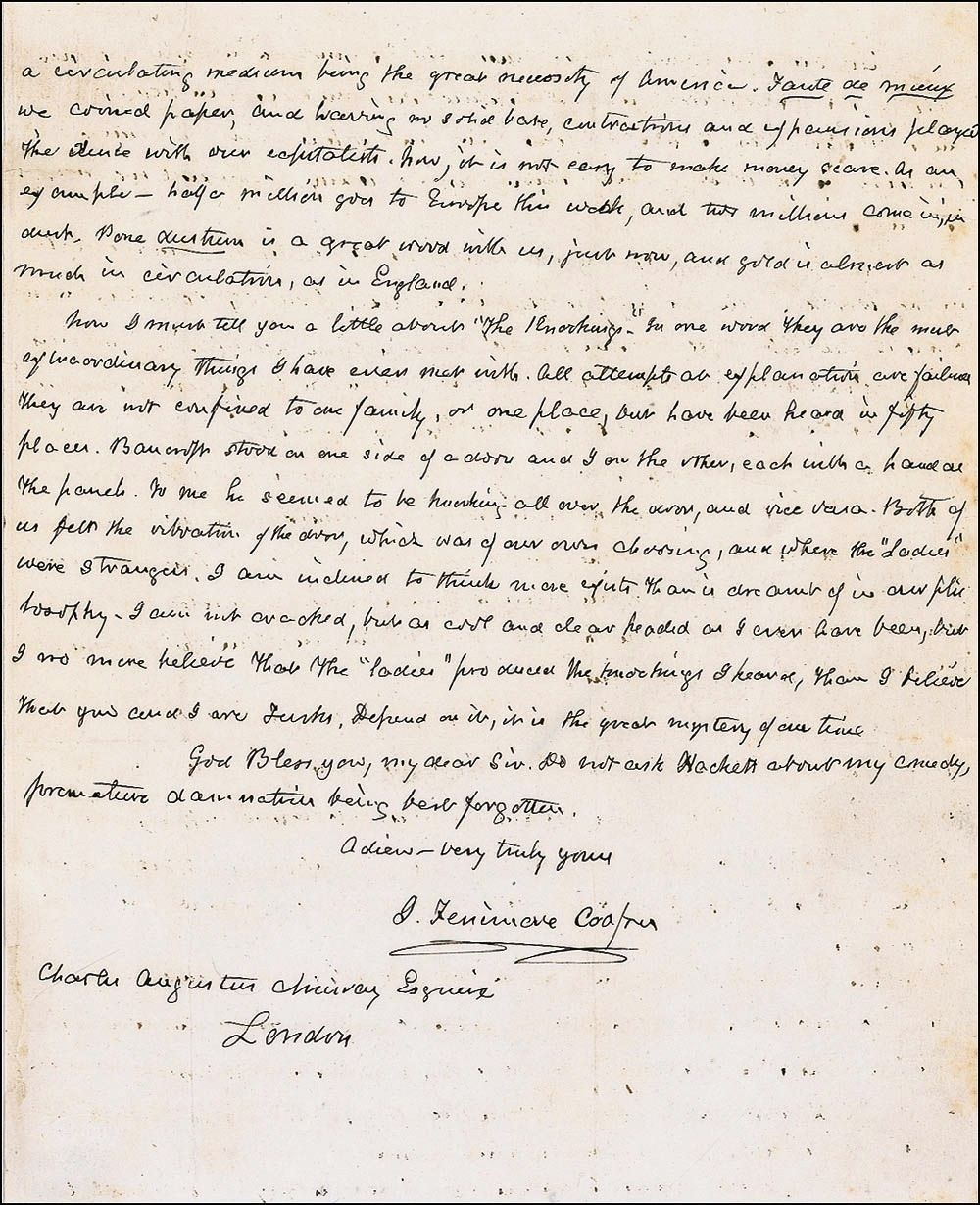 Cooperstown, 23 October 1850. Letter. Fine condition with dark ink in a Fine folder of this exceptional letter. An incredible three-page AUTOGRAPH LETTER SIGNED on two sheets of 8-1/2" x 6-7/8" paper by the author of THE LAST OF THE MOHICANS written on behalf of James Henry Hackett (1800-1871) to his old friend Charles Augustus Murray (1806-1895) who was at this time consul-general in Egypt. In part: After imparting news of Hackett, Cooper reports on his age and on the development of his country: "Half my time passes me, in looking back. At sixty, if a man is ever to sum up the good and evil of his past life, it is high time he began. I was sixty-one last September and have grown gray. We are 'progressing' as we Americans call it, at a famous rate. New York must have doubled its population, recently, since you saw it.... Taking all things together, I regard New York as the most remarkable town in the world.... Trade is driving all before it, and has fairly invaded Broadway.... Talking of the dust, which is so shortly to be my portion [Cooper died the next year], one of the most painful of my recollections of my own travels, is the great number of the dead, among the acquaintances I made. At one time it really seemed as if to know me was to die.... My eldest daughter, whom you may remember, has ventured to give the world a book called 'Rural Hours.' In this country it has done very well.... There is a good deal of rumbling in our body politic, but I think nothing will come of it, just now. The South has too much at stake to risk, and every day it loses, increases the disparity of the forces. This acquisition of California, hems in slavery, which must finally fall of its own weight. What we are to do with the blacks, God knows, but we shall never amalgamate." Cooper goes on to discuss the importance of gold in expanding business ("a circulating medium being the great necessity of America") and devotes a paragraph to a paranormal phenomenon which he calls "the knockings": "All attempts at explanation are failures. They are not confined to one family, or one place, but have been heard in fifty places." He closes "Do not ask Hackett about my comedy, premature damnation being best forgotten." Housed in a cloth folder titled on the spine.