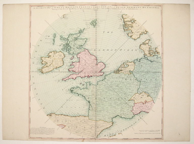 This unusual yet beautiful hemispherical projection of Western Europe is centered on London, such that the compass bearings are drawn as straight lines. The map has a 700 mile radius that encompasses the Faroe Islands, Bergen in Norway, Munich in Germany, Parma in Italy, the northern and eastern coasts Spain, including parts of Majorca and Minorca. Countries, counties, and cities are all labeled. The map also features lovely pastel hand-coloring, with England colored a vibrant pink that stands out markedly against pale green France. In fact, the latter country seems almost to fade into the water, another possible element of the map's colonial-era image of British supremacy. An annotation in the lower left corner attests to the map's accuracy. The map is in good condition with very minor tears and wear to the edges of the sheet, not affecting the image. Small stain on the bottom border and very minor foxing.