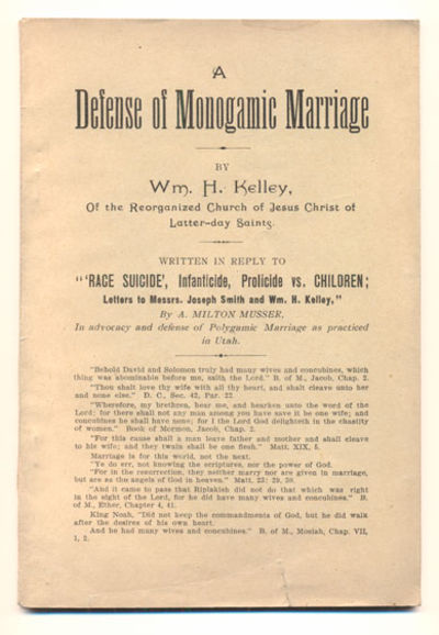 A Defense of Monogamic Marriage by Wm. H. Kelley, of the Reorganized Church of Jesus Christ of Latter-Day Saints Written in Reply to "Race Suicide, Infanticide, Prolicide vs. Children; Letters to Messrs. Joseph Smith and Wm. H. Kelley," by A. Milton Musser, In advocacy and defense of Polygamic Marriage as practiced in Utah / bound with/ The Basis of Brighamite Polygamy: A Criticism upon the (so called) Revelation of July 12th, 1843