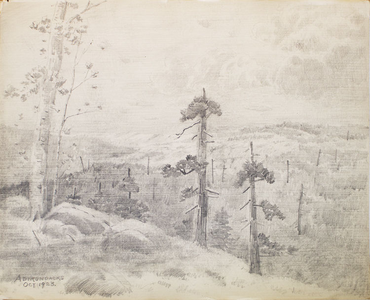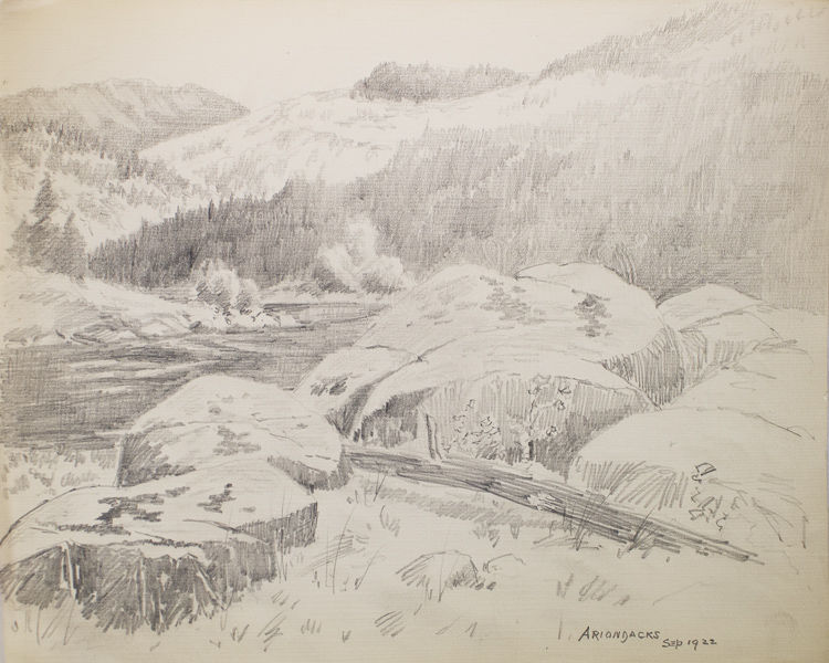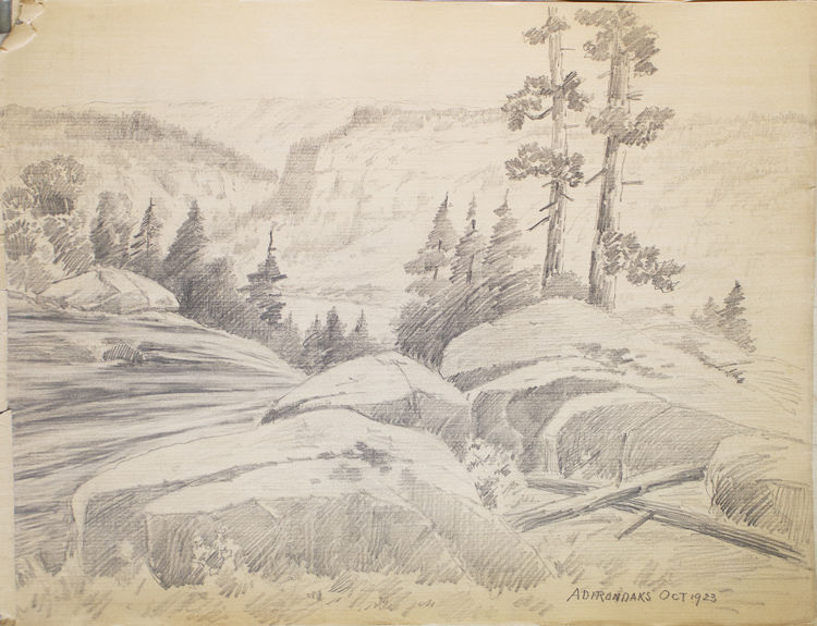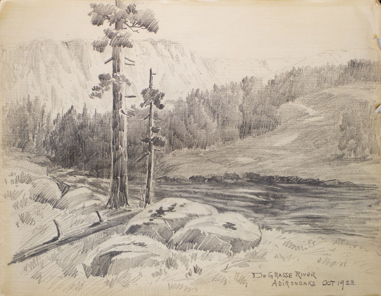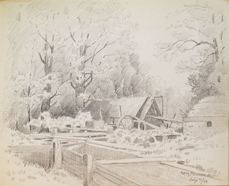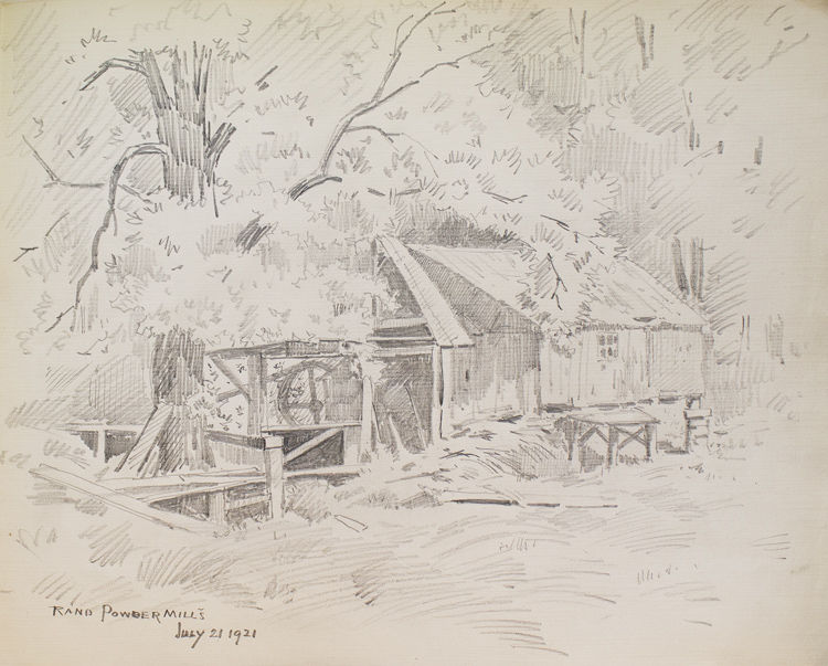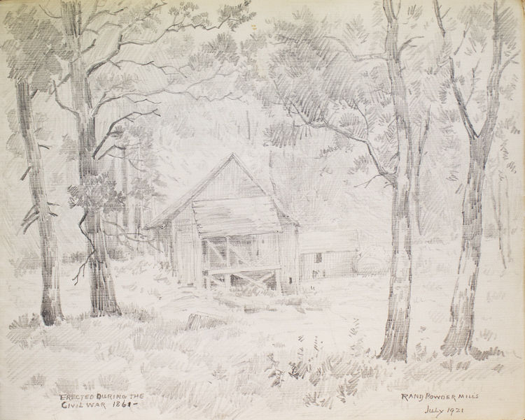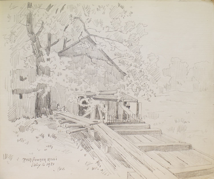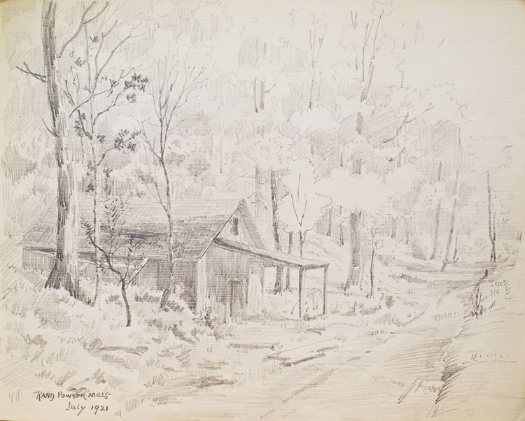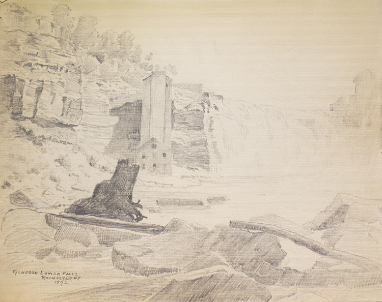 Thirteen amateur pencil drawings on paper of Scenes of Mills in Adirondacks, Rochester "Genessee Lower Falls, Rand Powder Mills, Monroe Co., NY. (6), De Grasse River, Adirondacks (4)