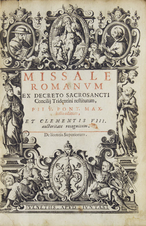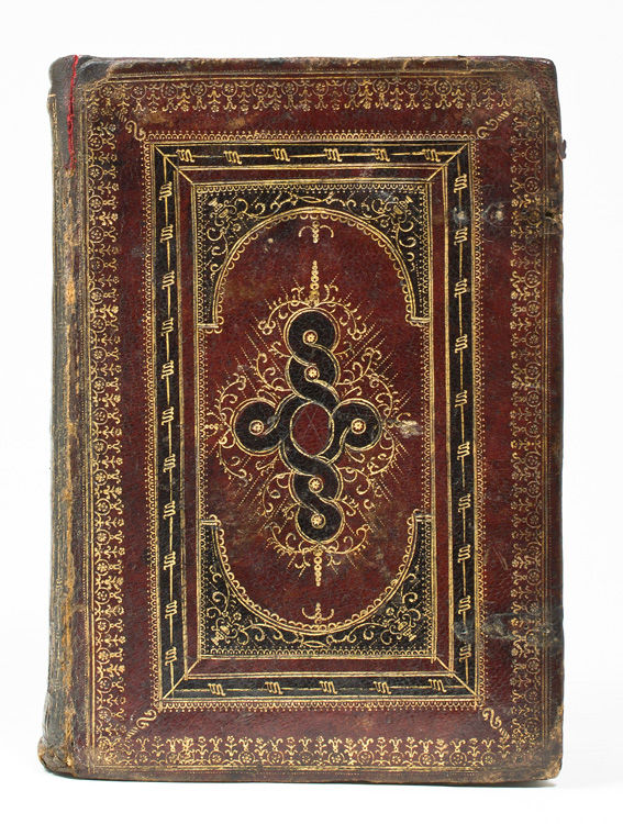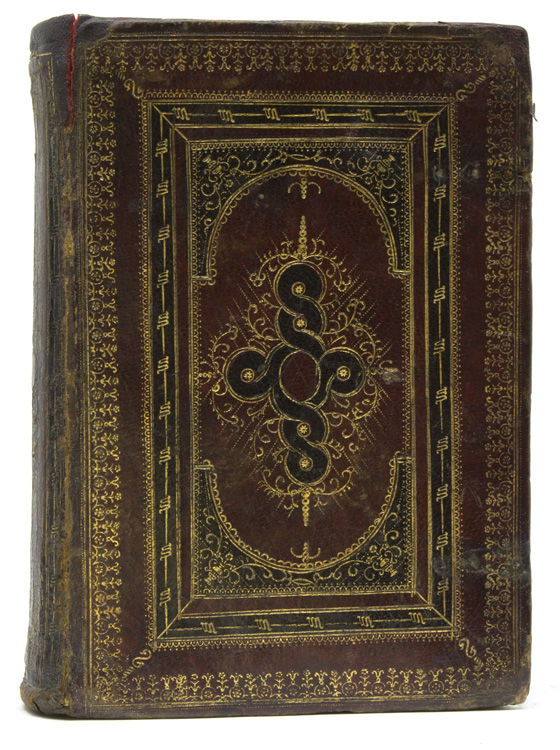 Venetiis [Venice]: Juntas, 1618. Title with engraved border, 11 full-page engravings, black chant notation on red four-line staves, [lxiii], [i], 557, [3]; 24; 14 pp., text in double columns, printed in red and black. 8vo. Bound in contemporary maroon morocco, richly gilt, black morocco inlaid panel border surrounding central inlaid entrelac design, rebacked, preserving original spine, lacking clasps and catches, a.e.g., joints rubbed, front joint starting, some light foxing throughout, contemporary and early ownership notes to endpapers. Title with engraved border, 11 full-page engravings, black chant notation on red four-line staves, [lxiii], [i], 557, [3]; 24; 14 pp., text in double columns, printed in red and black. 8vo.