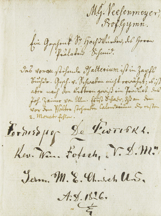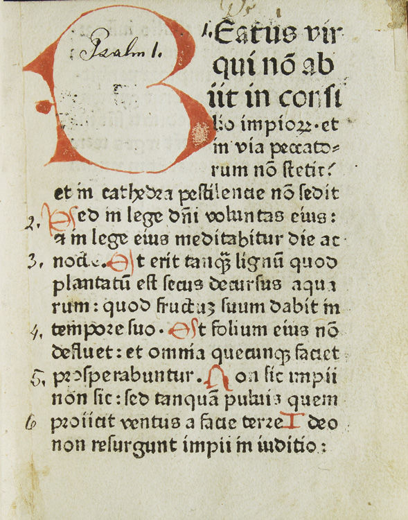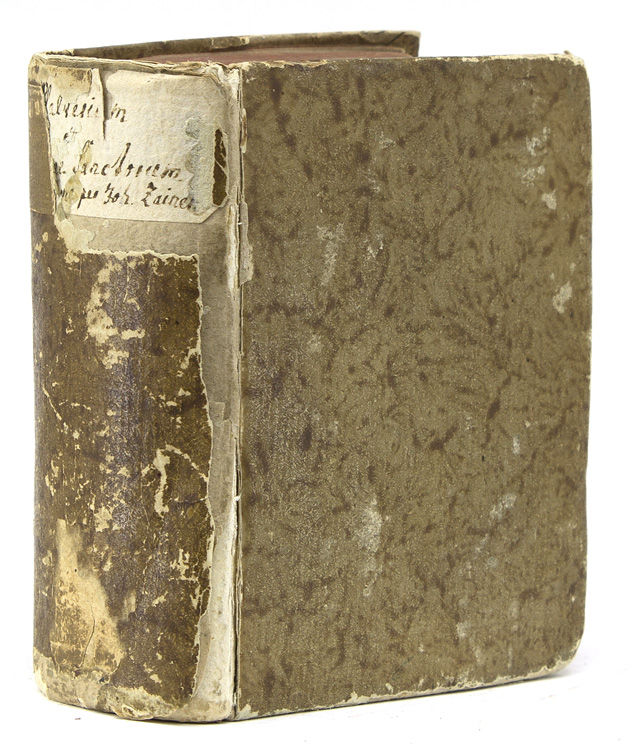 Ulm: Johann Zainer, 1480. [293 of 296 leaves; lacking first 2 leaves of the Calendar, and final blank. [•6 ••8 a–x8 y12 z8 A–L8 M3]. 1 vols. 8vo; 111 x 90 mm. Bound in 18th-century paper boards, with remnant of morocco spine label, edges stained red. Spine defective and covers rubbed, but binding is sound; several leaves bear stubs at outer edge from former index tabs; first leaf of Psalter extended at inner margin; final two leaves slightly waterstained; some browning and occasional stains; text block seriously trimmed but never into text. Notes on front endpapers, and a presentation inscription in 1826 from a member of the German Methodist Episcopal Church U.S. In a custom half-morocco slipcase and chemise. [293 of 296 leaves; lacking first 2 leaves of the Calendar, and final blank. [•6 ••8 a–x8 y12 z8 A–L8 M3]. 1 vols. 8vo; 111 x 90 mm. Johann Zainer the Elder (fl. 1472-93) established the first printing press at Ulm, where his first book is dated 1473. This pocket psalter by Zainer is undated; the colophon gives only the printer’s name and the city in which it was printed. ISTC gives a conjectural date of around 1480.