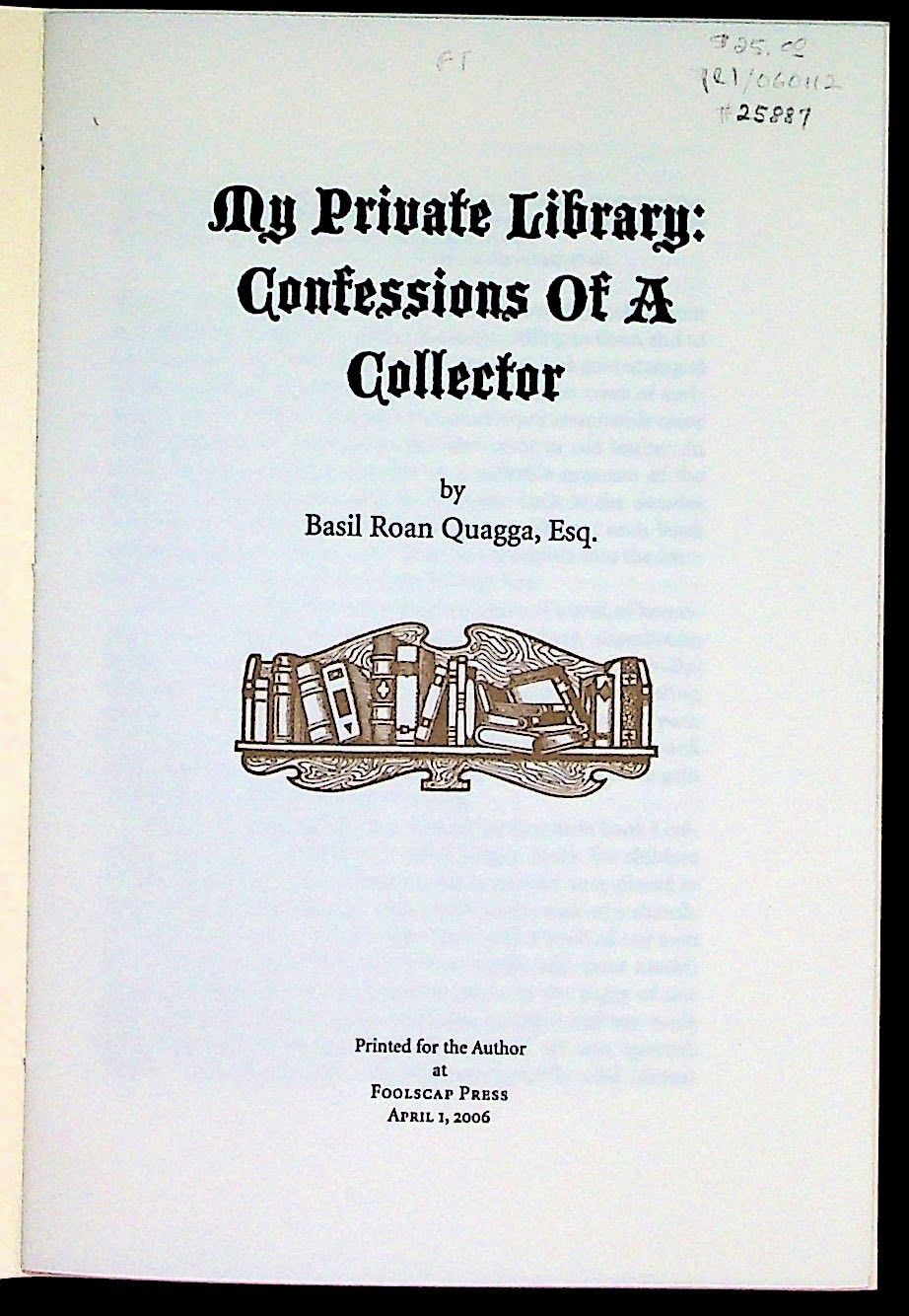 Foolscap Press, 2006. Hardcover. Fine. Hardcover. The Foolscap Press prints a humorous piece every April Fools Day, of which this is the selection for 2006. Bibliophile Basil Roan Quagga, Esq describes the beginnings of his book collecting journey as a child through is adult years of colleting fine books. His essay is filled with humorus anecdots. Fine in paper wrappers with brown decoration to front panel. Pristine interior. 9 pages. BOB/060112.