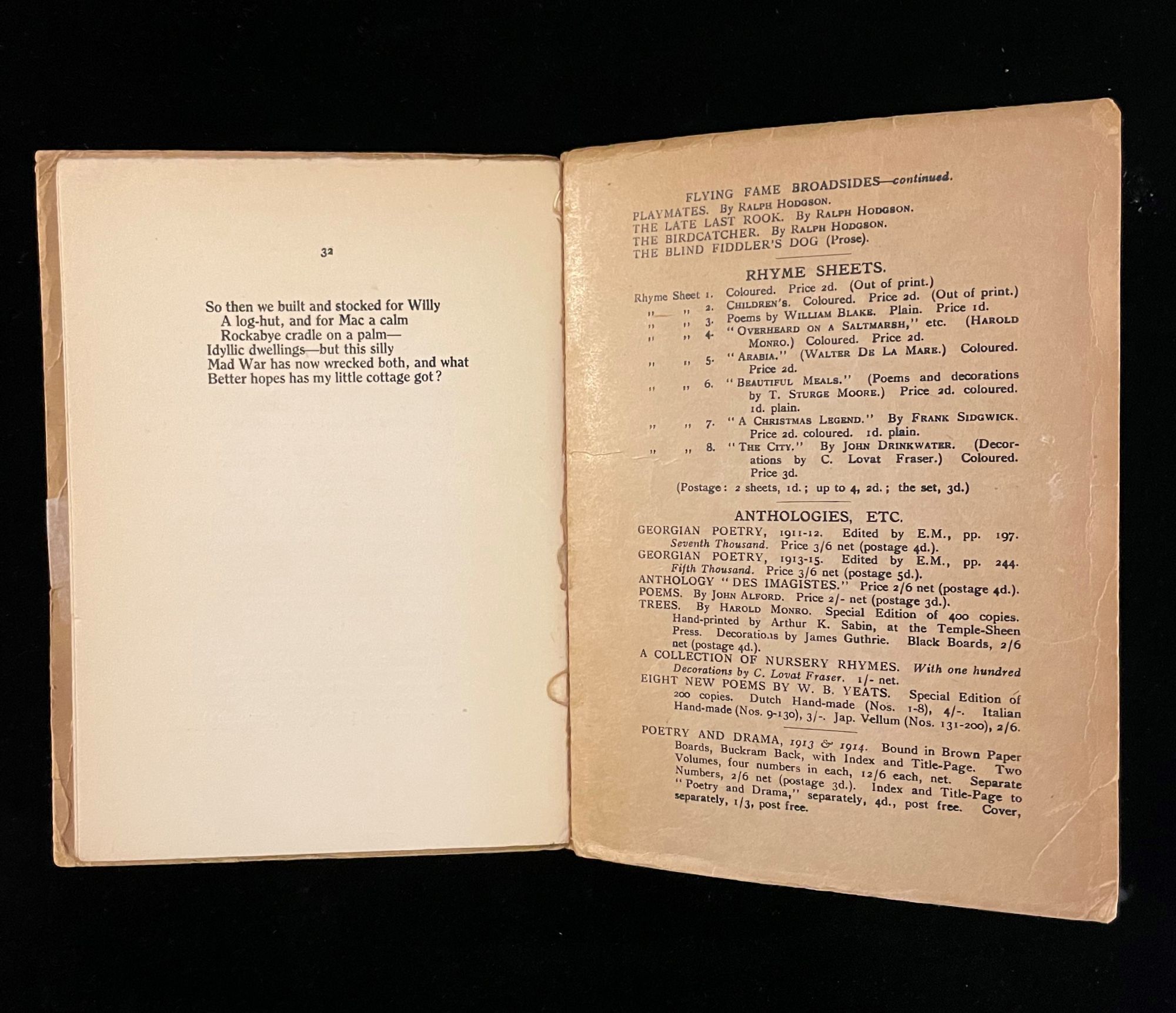 London: The Poetry Bookshop, 1916. First Edition, Second Impression. Soft cover. Very Good. Claud Lovat Fraser. Original printed wrappers with a colored woodcut by Claud Lovat Fraser. Front side yapped edge carefully re-inforced for an inch with archival tape. Still a very presentable copy.