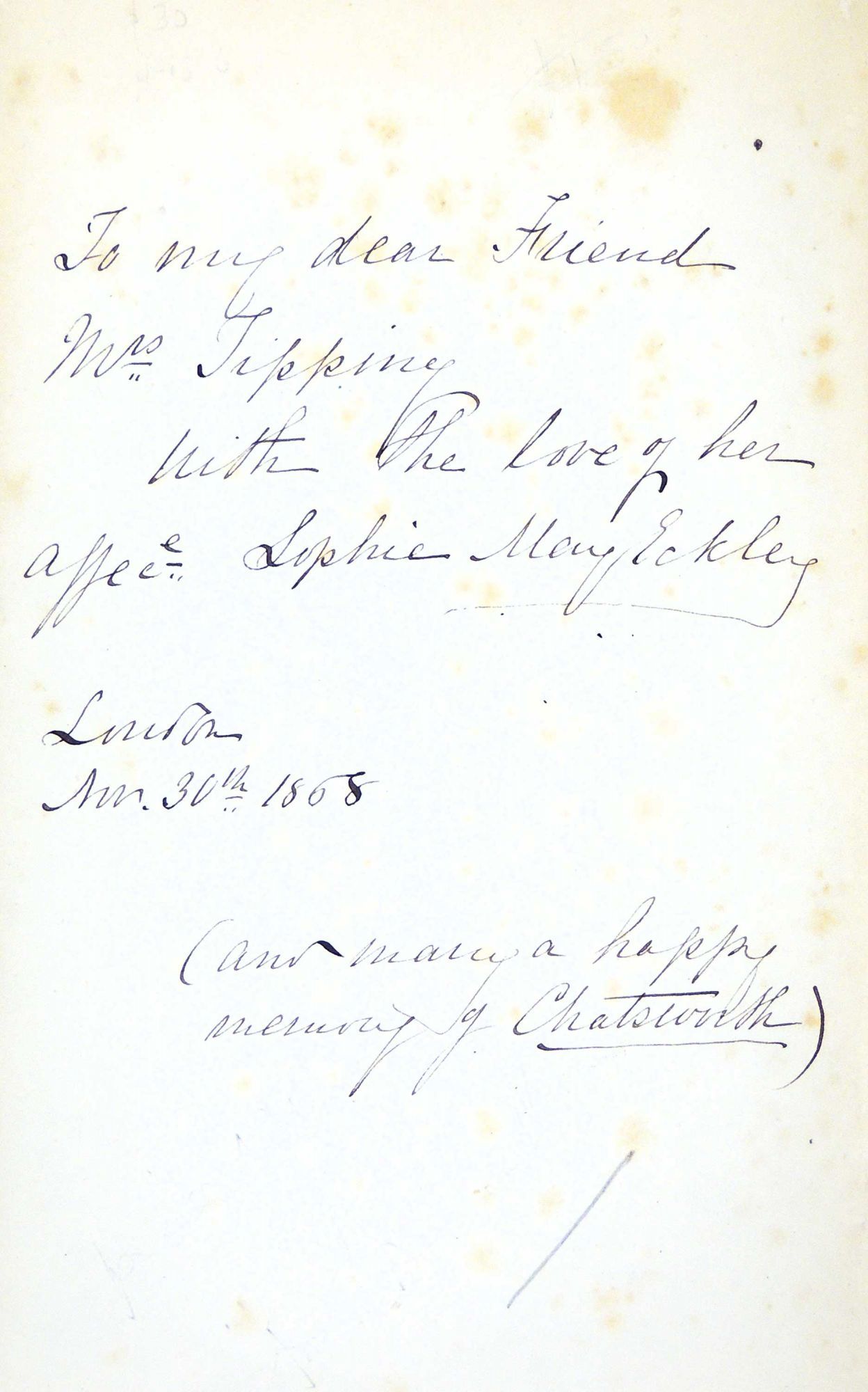 London: Bell and Daldy, 1869. Hardcover. Very Good. Hardcover. Presentation Copy. Inscribed "To my dear Friend Mrs. Tipping with the love of her affec[tionate] Sophie May Eckley. London Nov. 30th 1868 (and many a happy memory of Chatsworth). Eckley (1823 - 1874) was a wealthy American lady who became an intimate friend with Elizabeth Barrett Browning during a chance meeting in Italy. They had a falling out several years later, but much of their relationship is detailed in "The Brownings Correspondence." She authored several books including travelogues and poetry. This poetry collection includes poems on dreams, hymns, churches, flowers, Fontainbleau, memory, gardens, Handel, Alpine adventures, angels, art, and more.