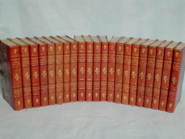 London: Gibbings & Co. Ltd, 1901. Limited Edition. 12mo. In 21 volumes limited to only 500 sets, The Florentine Edition. Includes The Decameron by Boccaccio, The Confessions of Rousseau, The Writings of Rabellais and Persian Letters by Charles Louis Montesquieu. Illustrations reproduced from the plates engraved for the celebrated edition of 1757, and designed by Gravelot, Eisen, Boucher and others, All volumes beautifully bound in 3/4 red morocco over marbled paper covered boards with matching endpapers, raised bands, lettered and decorated in a gilt floral motif with top edges gilt, silk ribbon markers. A fine set with only slight fading or spotting to few spines. Beautiful.