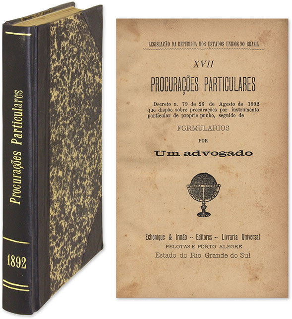 1892. A Collection of Brazilian Amendments [Brazil]. Procuracoes Particulares, Decreto N. 79 de 26 de Agosto de 1892 Que Dispoe Sobre Procuracoes por Instrumento Particular de Proprio Punho, Seguido de Formularios por um Advogado. Pelotas: Echenique & Irmao, 1892. 27, [3] pp. [Bound with] Lei No. 11 de 4 de Janeiro de 1896: Organisacao Political, Estado do Rio Grande do Sul. Porto Alegre: Officinas Typographicas de Echenique Irmaos & Cia., 1904. 15 pp. [And] Facturas ou Contas Assignadas: Reguladas Pelo Dec. N. 11527 de 17 de Marco de 1915 e Legislacao Referente. Com Annotacoes e Formulario. Pelotas: Echenique & C., 1915. 18, [1] pp., folding table. [And] Nova Regimento de Custas Judiciarias Contendo a Lei N. 11 de 28 de Novembro de 1896. Pelotas: Echenique & Irmao, 1896. 48, [1] pp. [And] Lei No 10 de 16 de Dezembro de 1895: Organisacao Judiciaria, Estado do Rio Grande do Sul. Porto Alegre: Officinas Typographicas de Echenique Irmaos & Comp., 1903. 108, 20 pp. [And] Teixeira, Luiz Candido, Annotator. Decretos Nos. 63 e 64 do Governo do Estado do Rio Grande do Sul Dando Regulamento as Custas e Taxa Judiciaria Approvado Pelo Congresso do Estado Pelos Decretos Nos. 11 e 12. Explicado por um Promptuario em Forma de Abcdario. Porto Alegre: Typographia de Cesar Reinhardt, 1897. 167 pp. Octavo (9" x 6"). Later three-quarter calf over marbled boards, gilt title (Procuracoes Particulares, 1892) to spine. Light rubbing to boards and extremities. Some browning to text, minor tears and chips to edges of some leaves. Later owner stamps in a few places, interior otherwise clean. $500. * This is a collection of amendments. The first three address the Brazilian Civil Code, the final three address that of the State of Rio Grande do Sul. All are well-annotated and the final two are, in essence, brief treatises. No copies of any title located on OCLC.