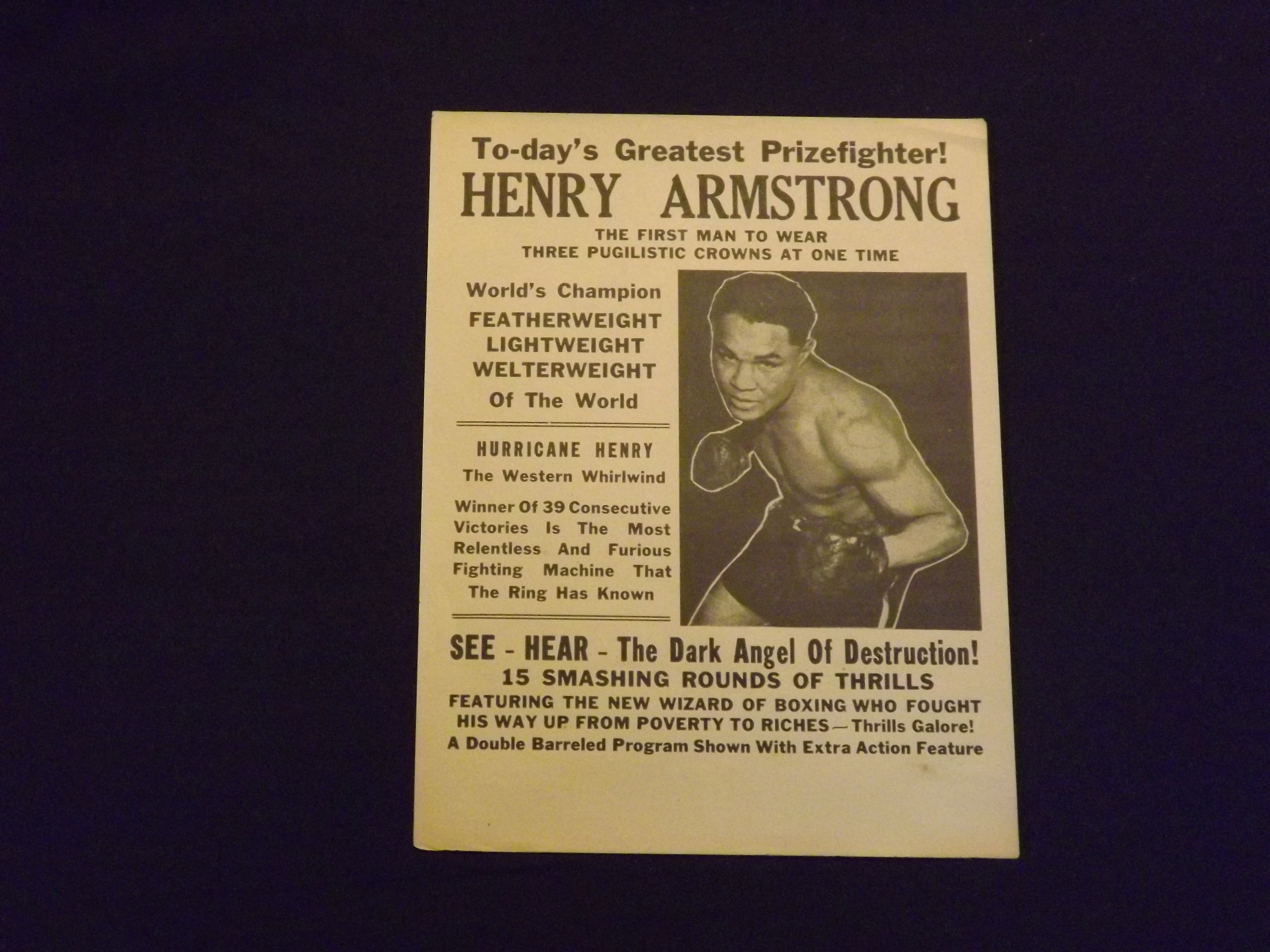 Boxing bill (poster) advertisement for Henry Armstrong fight film, 9"x 12," one sheet. Some aging and browning;otherwise very good. Henry Armstrong (1912-1988) is considered one of the best fighters in history. He held three titles at the same time, and almost won a fourth. Before Sugar Ray Robinson would come to dominate the fight scene, Hank Armstrong was second only to Joe Louis, as one of the most important black athletes in America during the first half of the last century. He is pictured on this movie bill, which also lists some of his fistic accomplishments.