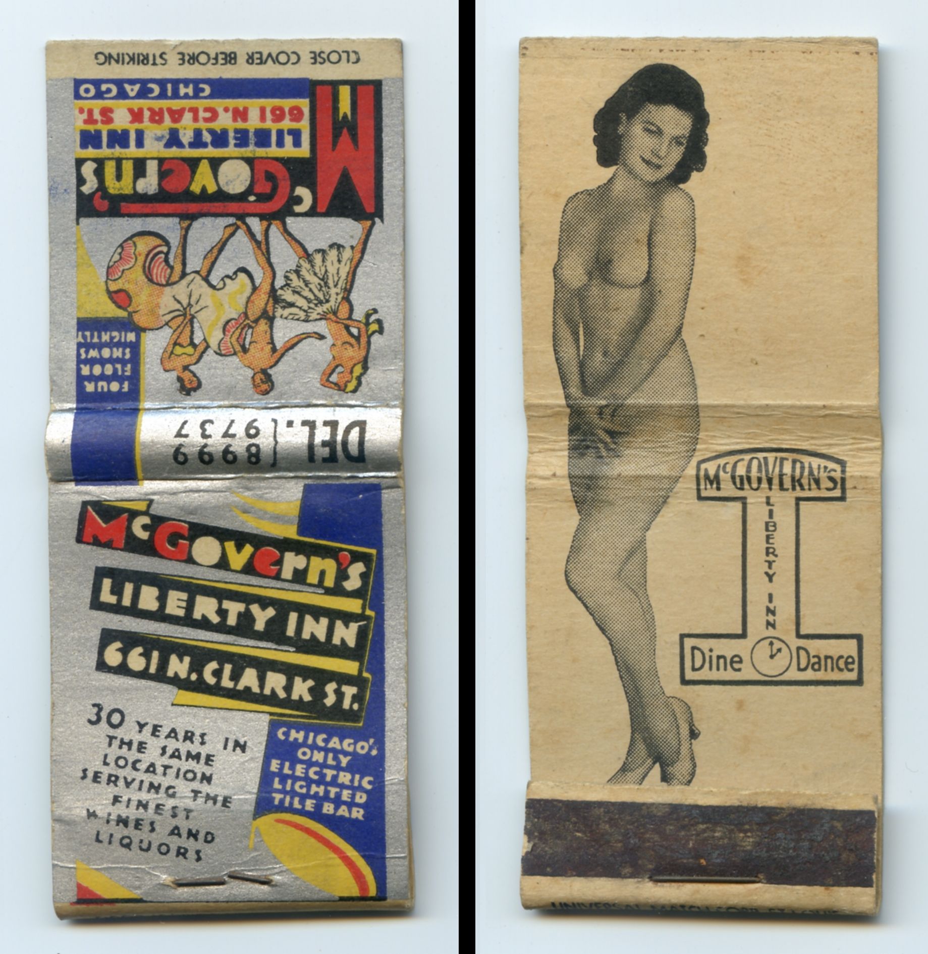 Chicago: 661 N. Clark St: (Universal Match Corp., St. Louis), 1950. Unbound. Very Good. Matchbook. Lacking the original match sticks, else a very good, vibrant example, printed in multiple colors, from Chicago's largest strip club in the early 1950s. The outside cover advertises the club as "Chicago's only electric lighted tile bar," with "four floor shows nightly," and features three girls in semi-states of undress. The removal of the match sticks from the inside cover reveals a black & white photograph of an alluring woman fully undressed, alongside McGovern's "Dine and Dance" logo. It was here during the gangster era that Dion O'Bannion, founder of the North Side Mob and the main rival of Johnny Torrio and Al Capone, worked as a singing waiter and became friends with Bugs Moran, Hymie Weiss, and "The Schemer" Drucci. A nice piece of Americana.