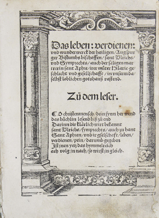 Das leben: verdienen: vnd wunderwerck der hailigen, Augspurger Bistumbs bischoffen, sant Vlrichs, vnd Symprechts, auch der säligen martrerin sant Aphre, irer müter Hilarie geschlecht vnd gesellschafft, in vnserm daselbst loblichen gotshauss rastend