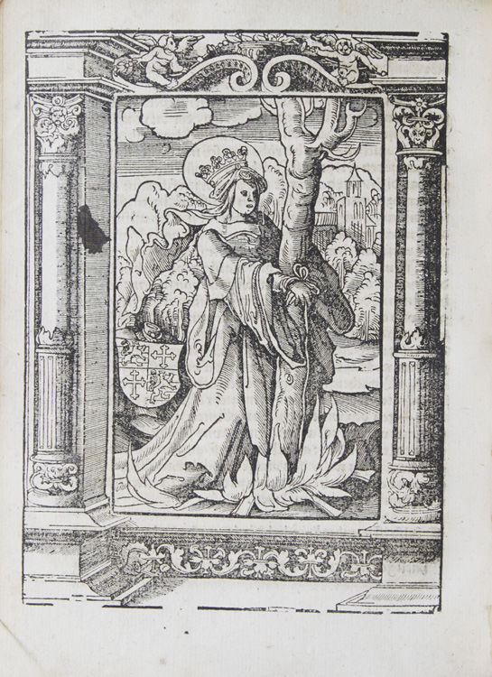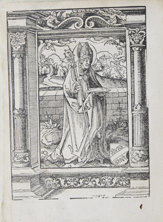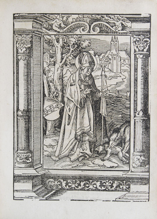 Augsburg: Sylvan Otmar, for the convent, 1516. First edition in German, translated from the Latin published in April of the same year. Title within architectural woodcut border and 5 full-page woodcuts by Leonard Beck, of which 3 are individual portraits of each of the patron Saints of Augsburg, one group portrait of all three together, and one (on final leaf) architetural rendering. 1 vols. Small 4to. Modern stiff gray wrappers, small perforation affecting last three penultimate leaves, with slight loss, title leaf soiled, very good overall. First edition in German, translated from the Latin published in April of the same year. Title within architectural woodcut border and 5 full-page woodcuts by Leonard Beck, of which 3 are individual portraits of each of the patron Saints of Augsburg, one group portrait of all three together, and one (on final leaf) architetural rendering. 1 vols. Small 4to. Lives of early Augsurg saints (Ulric, Saint, Bishop of Augsburg, 890-973; Simpert, Saint, Bishop of Augsburg, 778-807; and Afra, Saint, of Augsburg, d. ca. 304), translated from the Latin (Gloriosorum Christi confessorum Uldarici et Symperti) printed in April of the same year by Otmar. This first German edition was printed only a few months later with the same wonderful woodcuts by Leonard Beck, who was an assistant to Hans Holbein the Elder, and worked as a propagandist, designing woodcuts for works promoting Emperor Maximilian I.