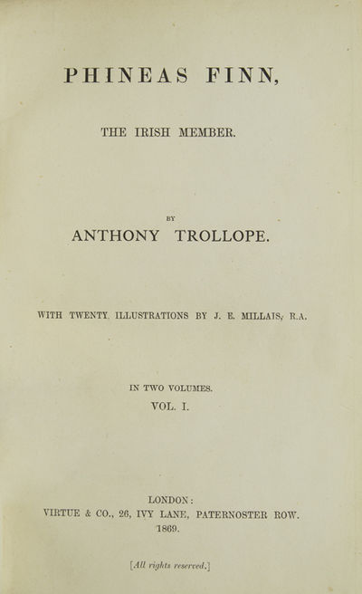London: Virtue, 1869. First Edition. With 20 illustrations by J.E. Millais. vi, [ii], 320; vi, [ii], 328pp. 2 vols. 8vo. Bound in three quarters blue morocco and blue cloth sides, t.e.g. Spines slightly faded, else fine. Bookplate. Milais, J. E. First Edition. With 20 illustrations by J.E. Millais. vi, [ii], 320; vi, [ii], 328pp. 2 vols. 8vo. Sadleir, Trollope, #30 (pp.89-91)