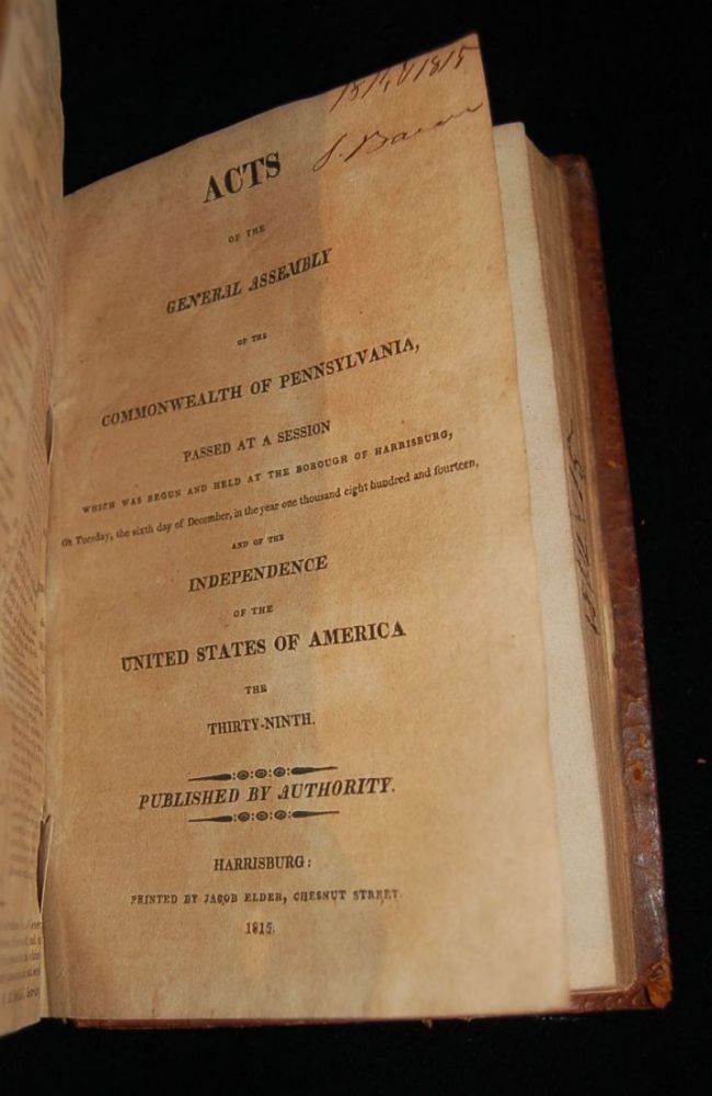 Philadelphia / Harrisburg: John Bioren / Jacob Elder, 1815. Full Leather. Good binding. Three volumes bound in one, 1812 and 1814 Acts have their title pages, 1813 is lacking the title page; full bound in sheep with morocco spine label; wear to the spine ends with some loss of the leather at the tail; scattered contemporary marginalia; contents are lightly toned; the title page for the 1812 volume has some loss in the inner margin; the volumes are noted in manuscript on the fore-edge;. Good binding.