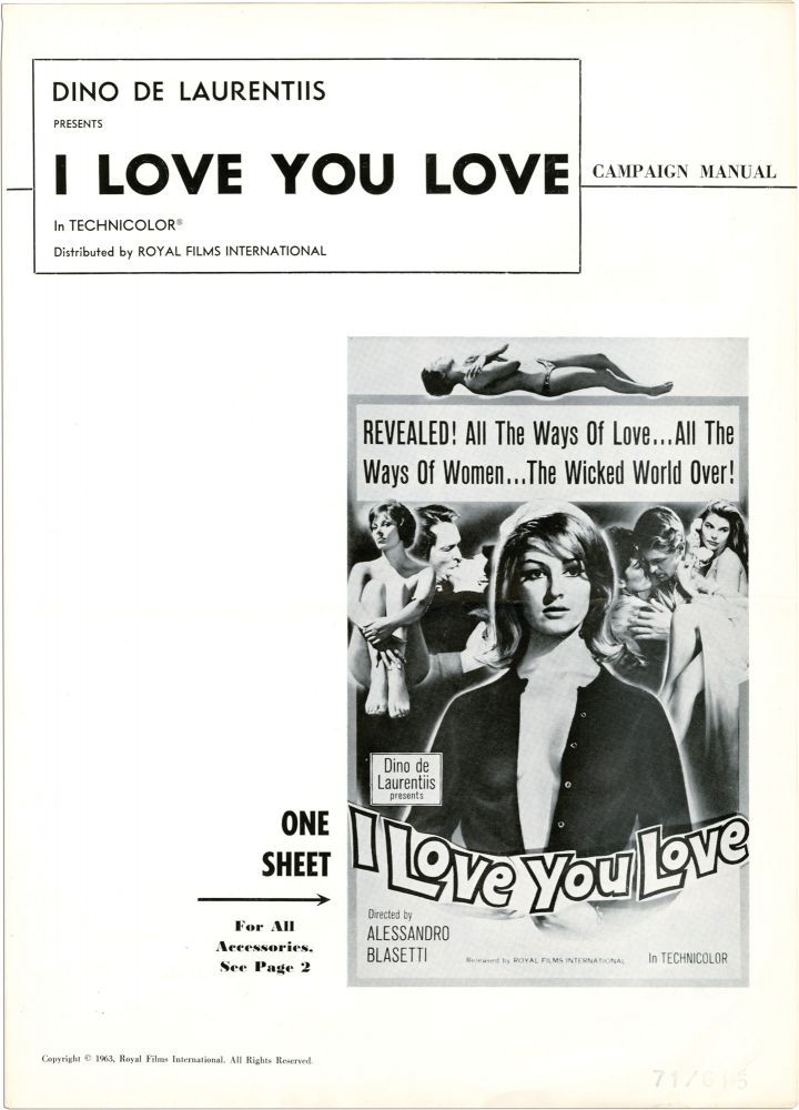 New York: Royal Films International, 1962. Original 1963 US Pressbook for the 1962 Finnish documentary film. Produced by Dino de Laurentiis, and filmed throughout Europe, the film is an expose of affection and its various means of display the world over. Nadia Lara's final film credit.