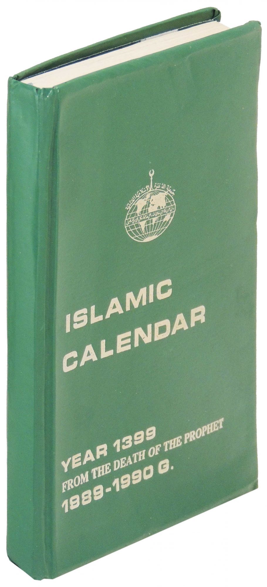 World Islamic Call Society, 1989. Hardcover. Near Fine. Hardcover. Scarce and interesting item from this Islamic organization. The World Islamic Call Society was established in 1972. It was led and funded by leading elements of the Gaddafi regime and comprised 250 Islamic organizations governed by a General Congress. It is believed that the society played a double-game by promoting Libyan interests as well as acting as a religious charity. One of its main focuses was to promote a version of Islam opposed to interfaith co-existence and seeking the establishment of a single - Islamic - religion. At the end of the Libyan civil war it was announced that some elements of the society would be purged, but that it would still serve as a religious charity. The calendar text is in both Arabic and English. It begins with a mission statement and an overview of its organizational structure. The rest of the volume is a conventional calendar with two days per page. Most interesting are the 32 color photographs, of which 16 are of Muammar Gaddafi, "the muslim leader." The other photos are of mosques, meetings, and one showing "traces of an American raid on Tripoli."