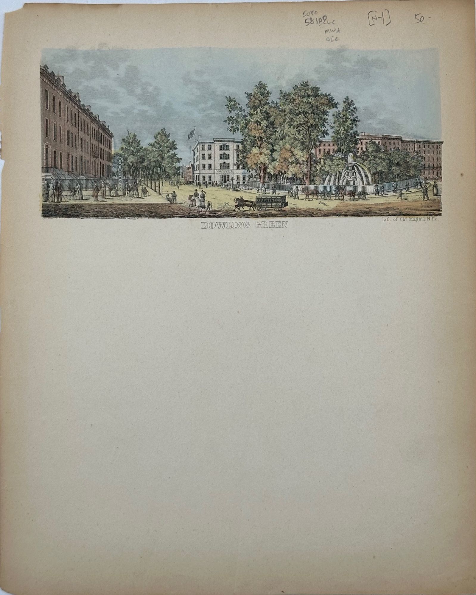 New York: Lith. of Chs. Magnus, 1850. Illustrated letter sheet, 10 3/8 x 8 3/8 inches. The color view at the head featuring a wooded square with a fountain in the foreground of a business district, the street teeming with pedestrians, horses and carriages, and riders on horseback; a corner building with the sign "Washington" is prominent. OCLC locates two copies (American Antiquarian Society, Library of Congress). Some browning and a little wear to the left edge, else very good. (#5030).