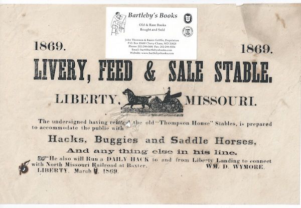 Liberty, MO: Wm. D. Wymore, 1869. Printed broadside, 7 3/4 x 11 3/4, employing several sizes and styles of type, including bold capitals for the head. Wymore (1835-1894) apparently took over the "Thompson House" Stables from a relative, George W. Wymore, who had established the business in the late 1840s. This copy appears to be a proof, with an editing mark in ink, changing the March date to "15" from a single digit. Not recorded on OCLC. Snag in the center affecting one word, soiled; still a good example of a rare illustrated trade broadside. (#5047).