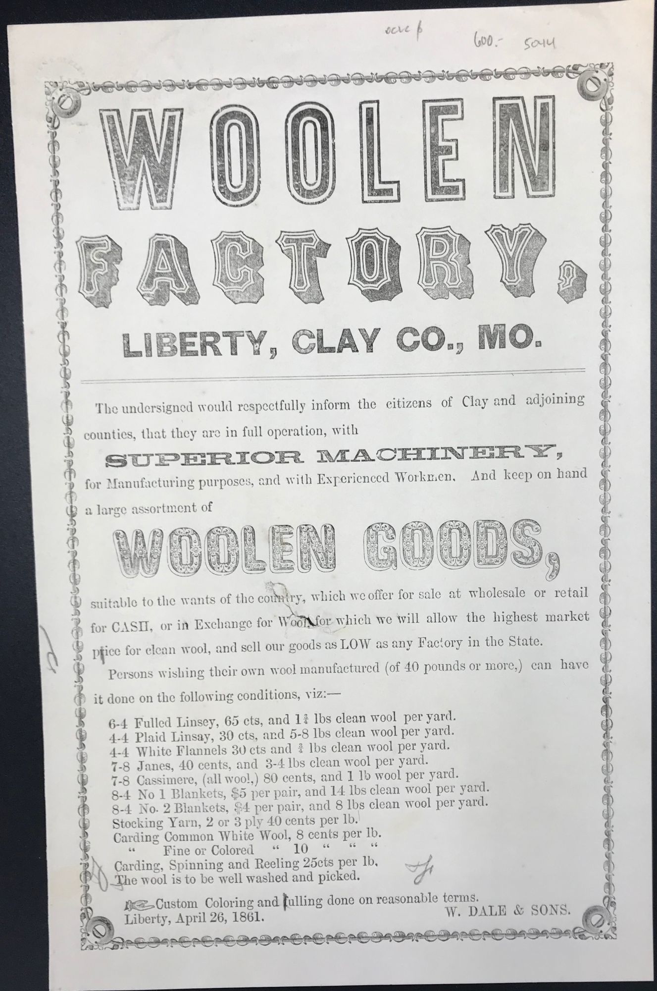 WOOLEN / FACTORY, / LIBERTY, CLAY CO., MO. / The undersigned would respectfully inform the citizens of Clay and adjoining / counties, that they are in full operation, with / Superior Machinery / for Manufacturing purposes, and with Experienced Workmen. And keep on hand / a large assortment of / WOOLEN GOODS, / [followed by 18 lines describing terms for specific woolen manufactures]. Signed in type at the end "W. Dale & Sons. / Liberty, April 26, 1861.