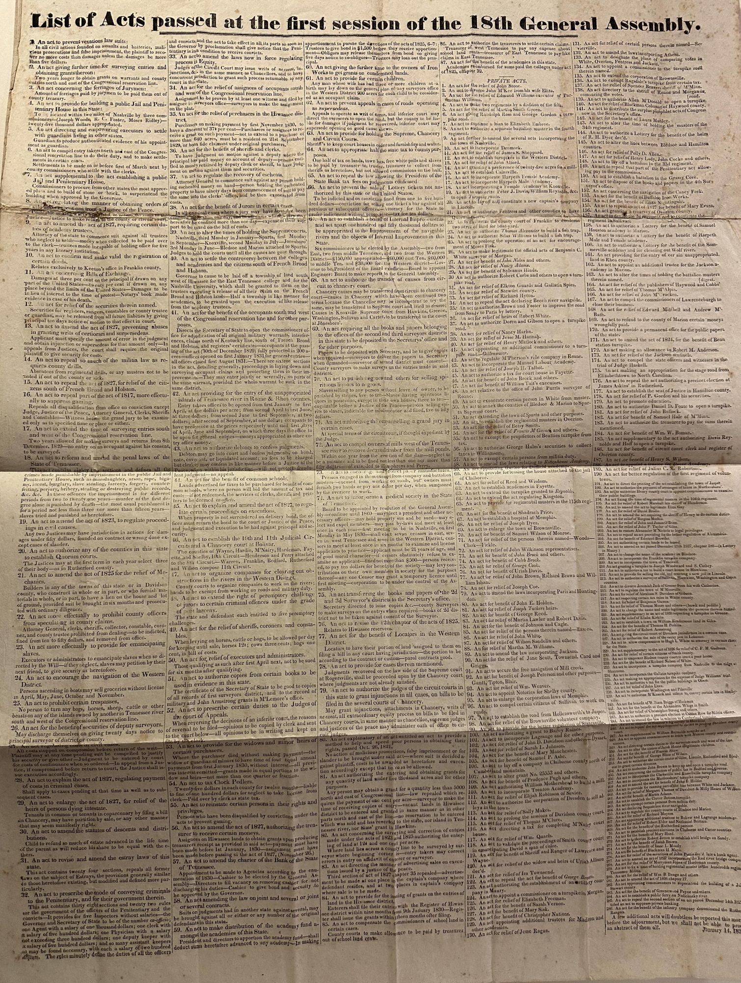 [Nashville, TN], 1830. Large printed broadside, 28 x 20 1/2 inches, the head in large bold type. One of the acts provided for the building and funding of a state penitentiary near Nashville, another accounted for the extensive reform of penal laws, another "more effectually [provided] for emancipating slaves" ("Executors or administrators to emancipate slaves when so directed by the Will -- if they neglect, slaves may petition by their next friend, to give security as heretofore"), and a fourth provided for the founding of a state medical society. Not in Allen's "Tennessee Imprints." Not recorded on OCLC. Folded; a little foxing, but a very good copy. (#5003).