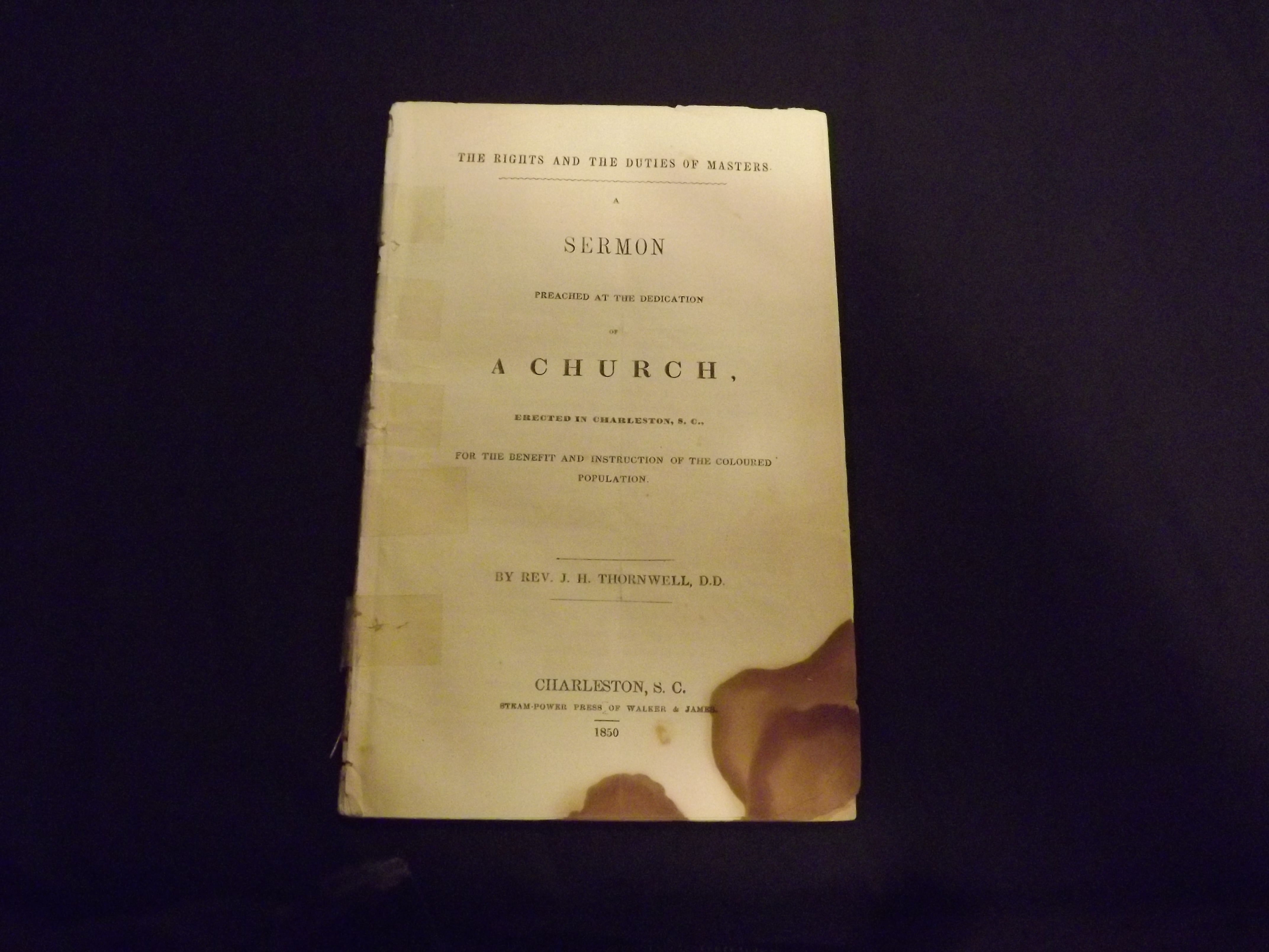 Pamphlet, 8vo, removed, disbound, 51 pp. Disbound, modern somewhat crude tape repairs to spine, ink stain in lower right corner throughout, a few chips at extremities, some minor foxing; still a decent copy. James Henley Thornwell (1812-1862) was a Presbyterian minister and educator born in the Marlboro District of South Carolina. He was educated at the Andover Theological Seminary and the Harvard Divinity School, and in 1835 he became the pastor at a new Presbyterian church in Lancasterville, South Carolina. The basic premise of this work is a justification for slavery. Thornwell uses scripture and religious to justify slavery, and to even address some of the arguments of abolitionists. He also appears to suggest that we are doing slaves a favor, and will earn their gratitude if we bring them to god, "They will feel that those are not tyrants who are striving to bring them to God." ANB. Sabin 95649. Work p 215.