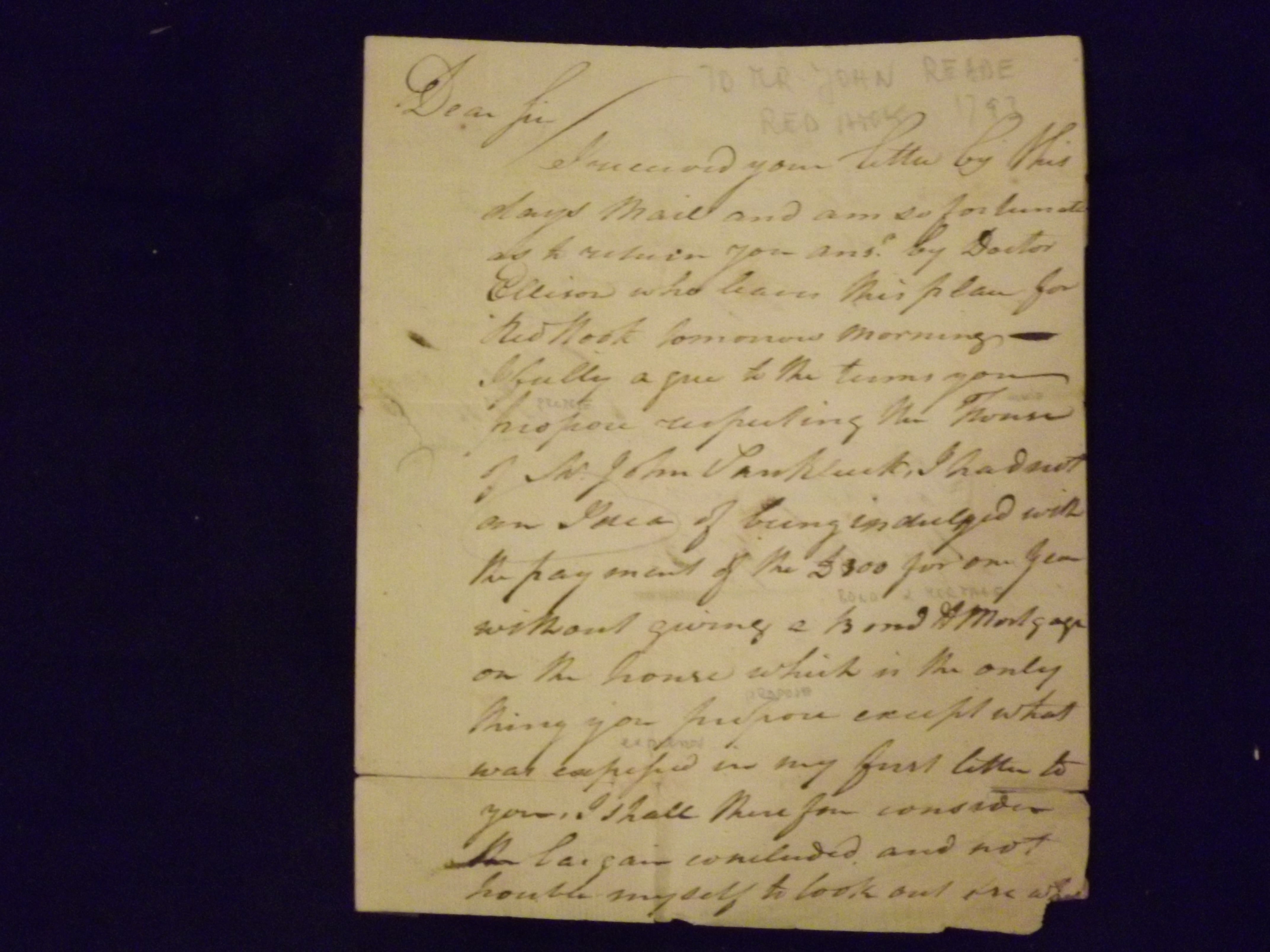 Small letter sheet, folded into four pages, 21 lines of text over two pages, docketed, remnant of old wax seal. Splits at some of the folds, partially repaired with archival tape, a couple of tears in the margins and along edges, piece missing from the second leaf, affecting a few letters, a few words penciled in by a previous owner, some aging and browning; despite the imperfections very legible, and in decent shape overall. This document relates to a letter to John Reade from Robert Horne agreeing to the terms of Reade renting a house in Red Hook for $300 a year. Presumably this refers to the Red Hook section of Brooklyn. The letter appears to have been delivers by a Doctor Edison, and is signed by Horne (not the most legible signature).